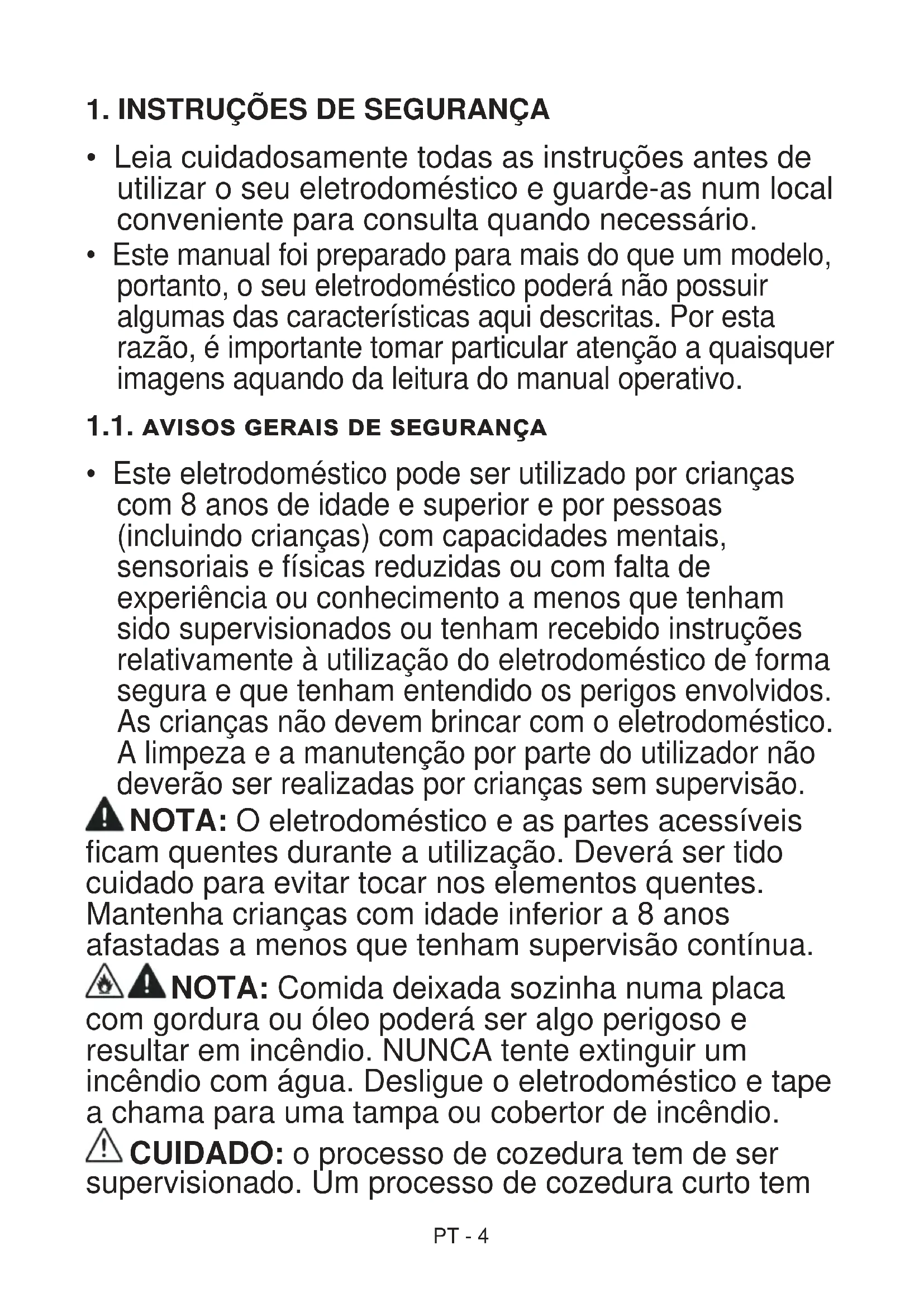 - Este eletrodoméstico pode ser utilizado por crianças com 8 anos de idade e superior e por pessoas (incluindo crianças) com capacidades mentais, sensoriais e físicas reduzidas ou com falta de experiência ou conhecimento a menos que tenham sido supervisionados ou tenham recebido instruções relativamente à utilização do eletrodoméstico de forma segura e que tenham entendido os perigos envolvidos. As crianças não devem brincar com o eletrodoméstico. A limpeza e a manutenção por parte do utilizador não deverão ser realizadas por crianças sem supervisão. NOTA: O eletrodoméstico e as partes acessíveis ficam quentes durante a utilização. Deverá ser tido cuidado para evitar tocar nos elementos quentes. Mantenha crianças com idade inferior a 8 anos afastadas a menos que tenham supervisão contínua. NOTA: Comida deixada sozinha numa placa com gordura ou óleo poderá ser algo perigoso e resultar em incêndio. NUNCA tente extinguir um incêndio com água. Desligue o eletrodoméstico e tape a chama para uma tampa ou cobertor de incêndio. CUIDADO: o processo de cozedura tem de ser supervisionado. Um processo de cozedura curto temPT - 5 de ser sempre supervisionado. NOTA: Perigo de incêndio: Não coloque itens sobre as superfícies de cozedura. NOTA: Se a superfície estiver rachada, desligue o eletrodoméstico para evitar a possibilidade de choque elétrico.