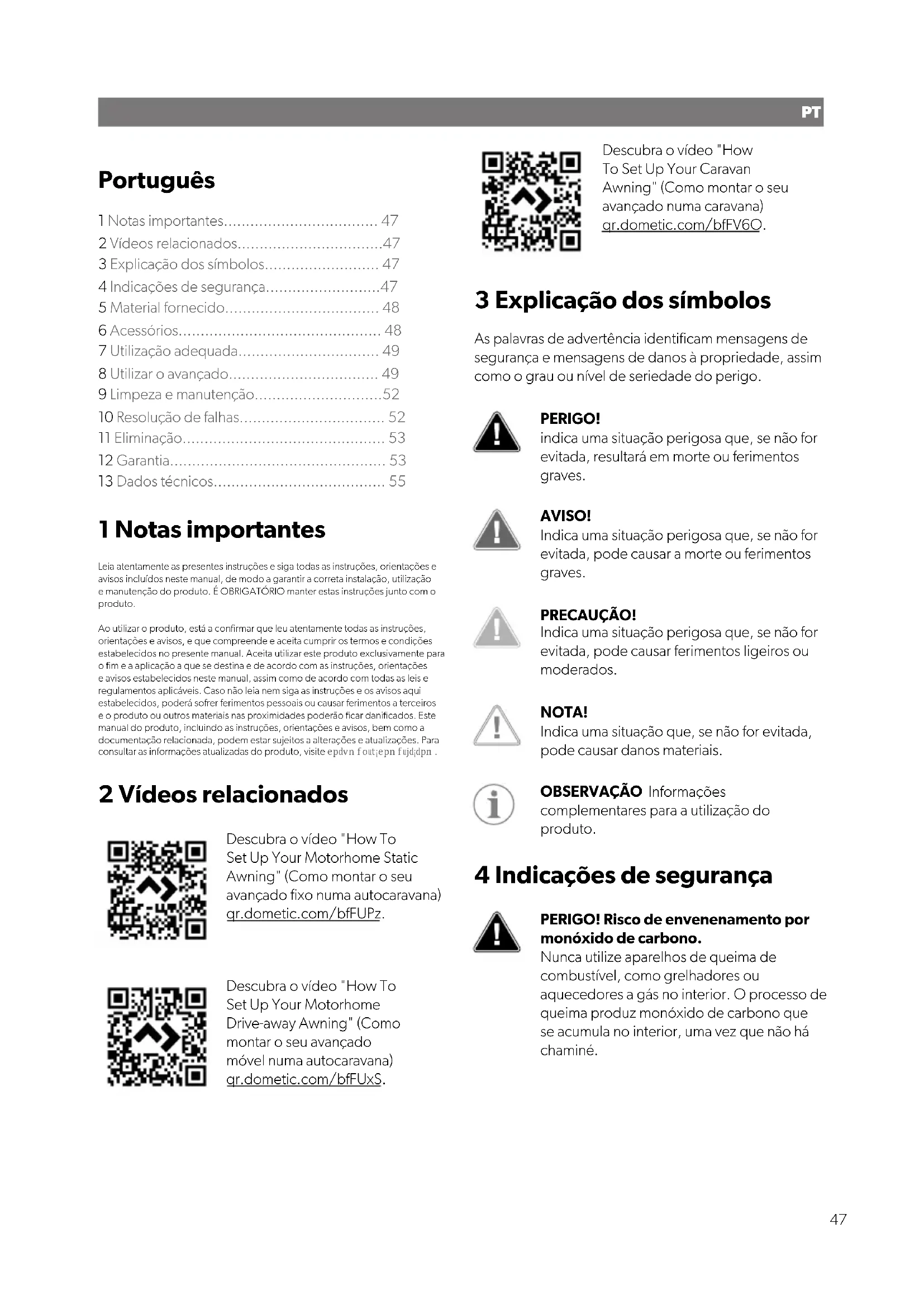 - El motivo de la reclamación o una descripción de la avería Tenga en cuenta que una reparación por medios propios o no profesionales puede tener consecuencias de seguridad y suponer la anulación de la garantía. La garantía cubre los defectos de fabricación, materiales y piezas. La garantía no cubre el descoloramiento de la lona ni el desgaste debido a la radiación ultravioleta, el mal uso, los daños accidentales, los daños por tormentas o el uso permanente, semipermanente o comercial. No cubre ningún daño resultante. Contacte con su distribuidor para realizar las reclamaciones. Esto no afecta a sus derechos legales. 45ES 13 Datos técnicos Ancho (mm) Profundidad (mm) Peso (kg) Peso mínimo (kg) Grande AIR Tour 390 S 390 300 24.5 /7.24 18.1 Grande AIR Tour 390 M 390 300 25.1 / 7.2 18.6 Rally AIR Tour 200 S 200 250 19 10.3 Rally AIR Tour 260 S 260 250 24.2 13.1 Rally AIR Tour 260 M 260 250 24.7 13.7 Rally AIR Tour 330 S 330 250 26 14.1 Rally AIR Tour 330 M 330 250 26.5 14.7 Rally AIR Tour 390 S 390 250 27.6 15.2 Rally AIR Tour 390 M 390 250 28.1 15.2 Rally AIR Tour 260 DA 260 250 25.1 / 7.2 15 Rally AIR Tour 330 DA 330 250 26.5 / 8.2 20.7 Rally AIR Tour 390 DA 390 250 27.1 / 9.1 24 Leggera AIR 220 S 220 240 8.7 7.4 Leggera AIR 260 S 260 240 12.2 8.4 Leggera AIR 260 M 260 240 12.6 9 46PT Português 1 Notas importantes................................... 47 2 Vídeos relacionados.................................47 3 Explicação dos símbolos.......................... 47 4 Indicações de segurança..........................47 5 Material fornecido................................... 48 6 Acessórios.............................................. 48 7 Utilização adequada................................ 49 8 Utilizar o avançado.................................. 49 9 Limpeza e manutenção.............................52 10 Resolução de falhas................................. 52 11 Eliminação.............................................. 53 12 Garantia................................................. 53 13 Dados técnicos....................................... 55 1 Notas importantes Leia atentamente as presentes instruções e siga todas as instruções, orientações e avisos incluídos neste manual, de modo a garantir a correta instalação, utilização e manutenção do produto. É OBRIGATÓRIO manter estas instruções junto com o produto. Ao utilizar o produto, está a confirmar que leu atentamente todas as instruções, orientações e avisos, e que compreende e aceita cumprir os termos e condições estabelecidos no presente manual. Aceita utilizar este produto exclusivamente para o fim e a aplicação a que se destina e de acordo com as instruções, orientações e avisos estabelecidos neste manual, assim como de acordo com todas as leis e regulamentos aplicáveis. Caso não leia nem siga as instruções e os avisos aqui estabelecidos, poderá sofrer ferimentos pessoais ou causar ferimentos a terceiros e o produto ou outros materiais nas proximidades poderão ficar danificados. Este manual do produto, incluindo as instruções, orientações e avisos, bem como a documentação relacionada, podem estar sujeitos a alterações e atualizações. Para consultar as informações atualizadas do produto, visite documents.dometic.com. 2 Vídeos relacionados Descubra o vídeo "How To Set Up Your Motorhome Static Awning" (Como montar o seu avançado fixo numa autocaravana) qr.dometic.com/bfFUPz. Descubra o vídeo "How To Set Up Your Motorhome Drive-away Awning" (Como montar o seu avançado móvel numa autocaravana) qr.dometic.com/bfFUxS. Descubra o vídeo "How To Set Up Your Caravan Awning" (Como montar o seu avançado numa caravana) qr.dometic.com/bfFV6O. 3 Explicação dos símbolos As palavras de advertência identificam mensagens de segurança e mensagens de danos à propriedade, assim como o grau ou nível de seriedade do perigo. PERIGO! indica uma situação perigosa que, se não for evitada, resultará em morte ou ferimentos graves. AVISO! Indica uma situação perigosa que, se não for evitada, pode causar a morte ou ferimentos graves. PRECAUÇÃO! Indica uma situação perigosa que, se não for evitada, pode causar ferimentos ligeiros ou moderados. NOTA! Indica uma situação que, se não for evitada, pode causar danos materiais. OBSERVAÇÃO Informações complementares para a utilização do produto. 4 Indicações de segurança PERIGO! Risco de envenenamento por monóxido de carbono. Nunca utilize aparelhos de queima de combustível, como grelhadores ou aquecedores a gás no interior. O processo de queima produz monóxido de carbono que se acumula no interior, uma vez que não há chaminé. 47PT AVISO! Perigo de incêndio