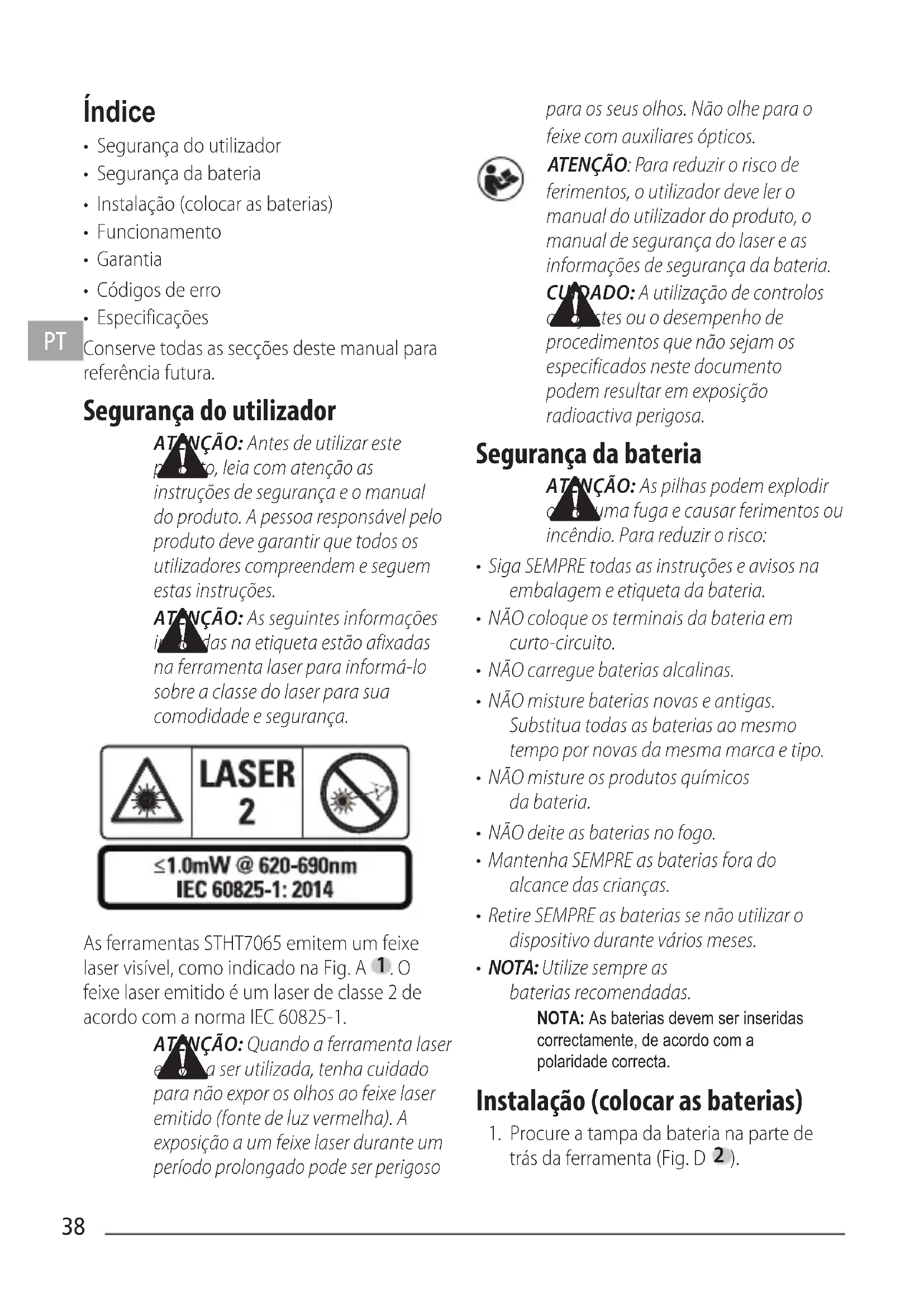 . O feixe laser emitido é um laser de classe 2de acordo com a norma IEC 60825-1. ATENÇÃO: Quando a ferramenta laser estiver a ser utilizada, tenha cuidado para não expor os olhos ao feixe laser emitido (fonte de luz vermelha). A exposição a um feixe laser durante um período prolongado pode ser perigoso para os seus olhos. Não olhe para o feixe com auxiliaresópticos. ATENÇÃO: Para reduzir o risco de ferimentos, o utilizador deve ler o manual do utilizador do produto, o manual de segurança do laser e as informações de segurança dabateria. CUIDADO: A utilização de controlos ou ajustes ou o desempenho de procedimentos que não sejam os especificados neste documento podem resultar em exposição radioactivaperigosa. Segurança da bateria