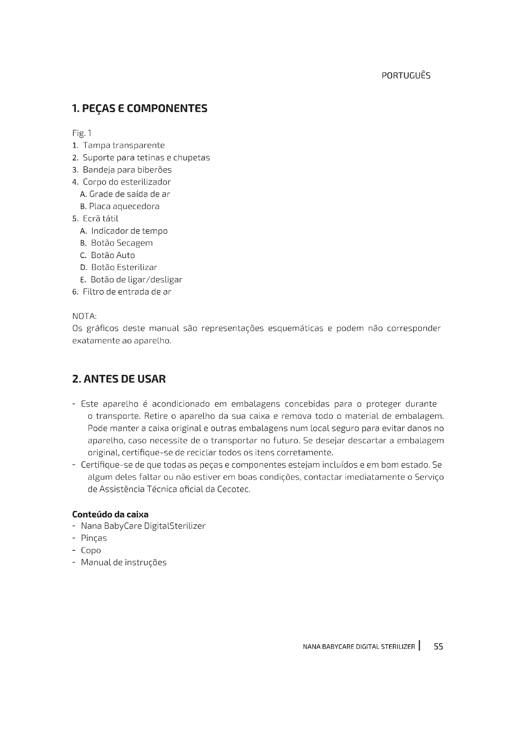 - Este aparelho é acondicionado em embalagens concebidas para o proteger durante o transporte. Retire o aparelho da sua caixa e remova todo o material de embalagem. Pode manter a caixa original e outras embalagens num local seguro para evitar danos no aparelho, caso necessite de o transportar no futuro. Se desejar descartar a embalagem original, certique-se de reciclar todos os itens corretamente. - Certique-se de que todas as peças e componentes estejam incluídos e em bom estado. Se algum deles faltar ou não estiver em boas condições, contactar imediatamente o Serviço de Assistência Técnica ocial da Cecotec. Conteúdo da caixa - Nana BabyCare DigitalSterilizer - Pinças - Copo - Manual de instruçõesNANA BABYCARE DIGITAL STERILIZER