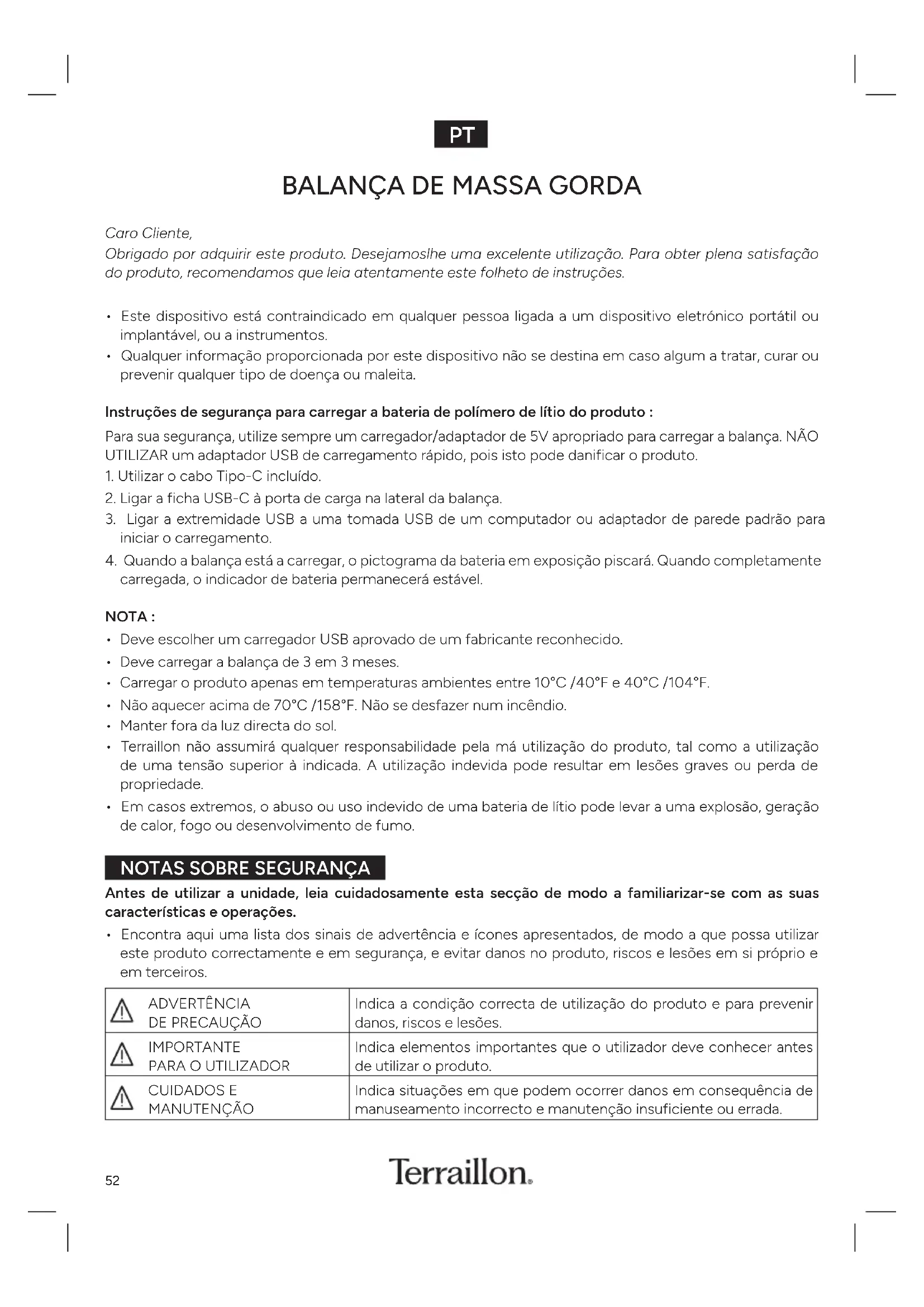 - Terraillon não assumirá qualquer responsabilidade pela má utilização do produto, tal como a utilização de uma tensão superior à indicada A utilização indevida pode resultar em lesões graves ou perda de propriedade