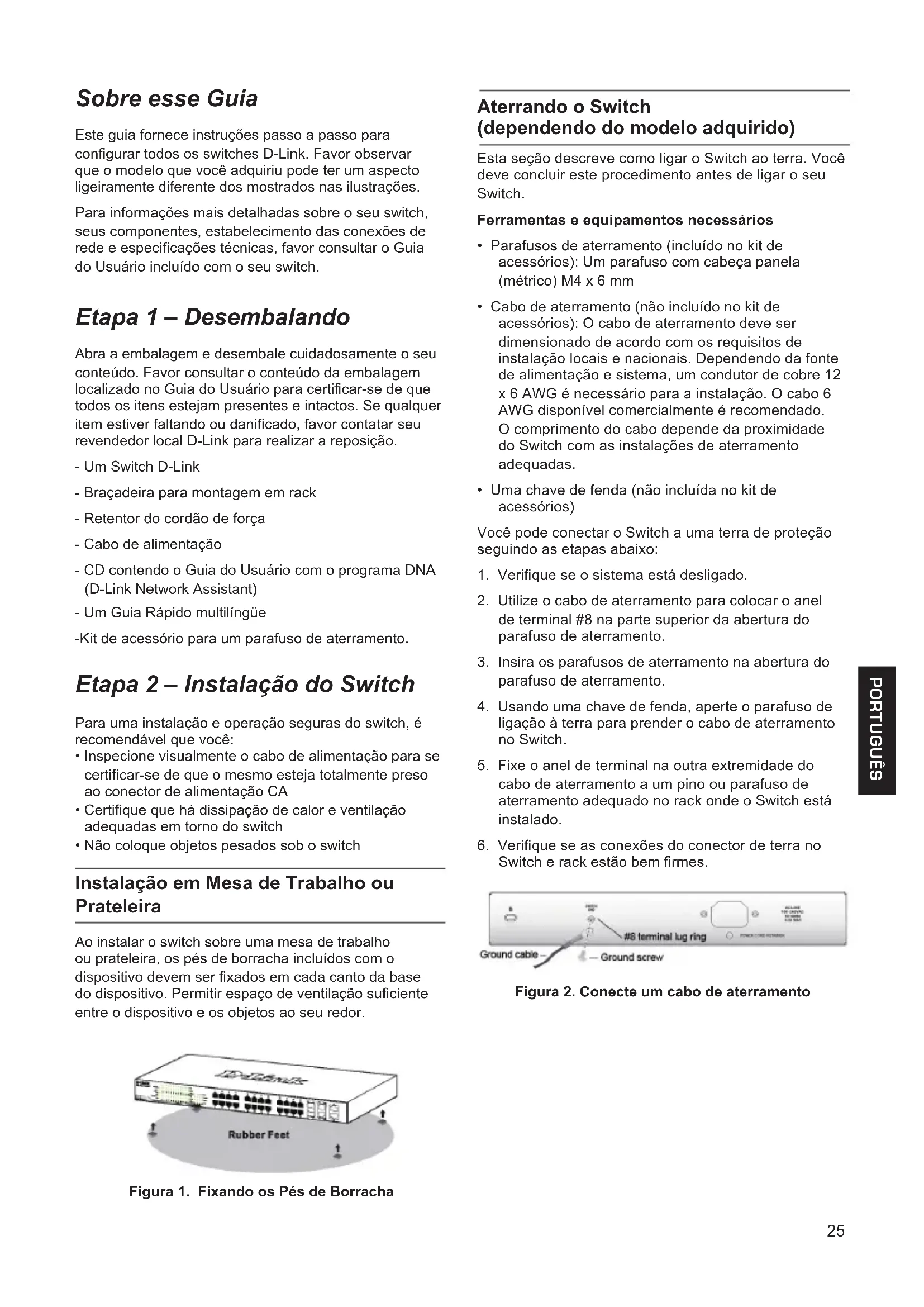 - Não coloque objetos pesados sob o switch Instalação em Mesa de Trabalho ou Prateleira Ao instalar o switch sobre uma mesa de trabalho ou prateleira, os pés de borracha incluídos com o dispositivo devem ser xados em cada canto da base do dispositivo. Permitir espaço de ventilação suciente entre o dispositivo e os objetos ao seu redor. Figura 1. Fixando os Pés de Borracha Aterrando o Switch (dependendo do modelo adquirido) Esta seção descreve como ligar o Switch ao terra. Você deve concluir este procedimento antes de ligar o seu Switch. Ferramentas e equipamentos necessários