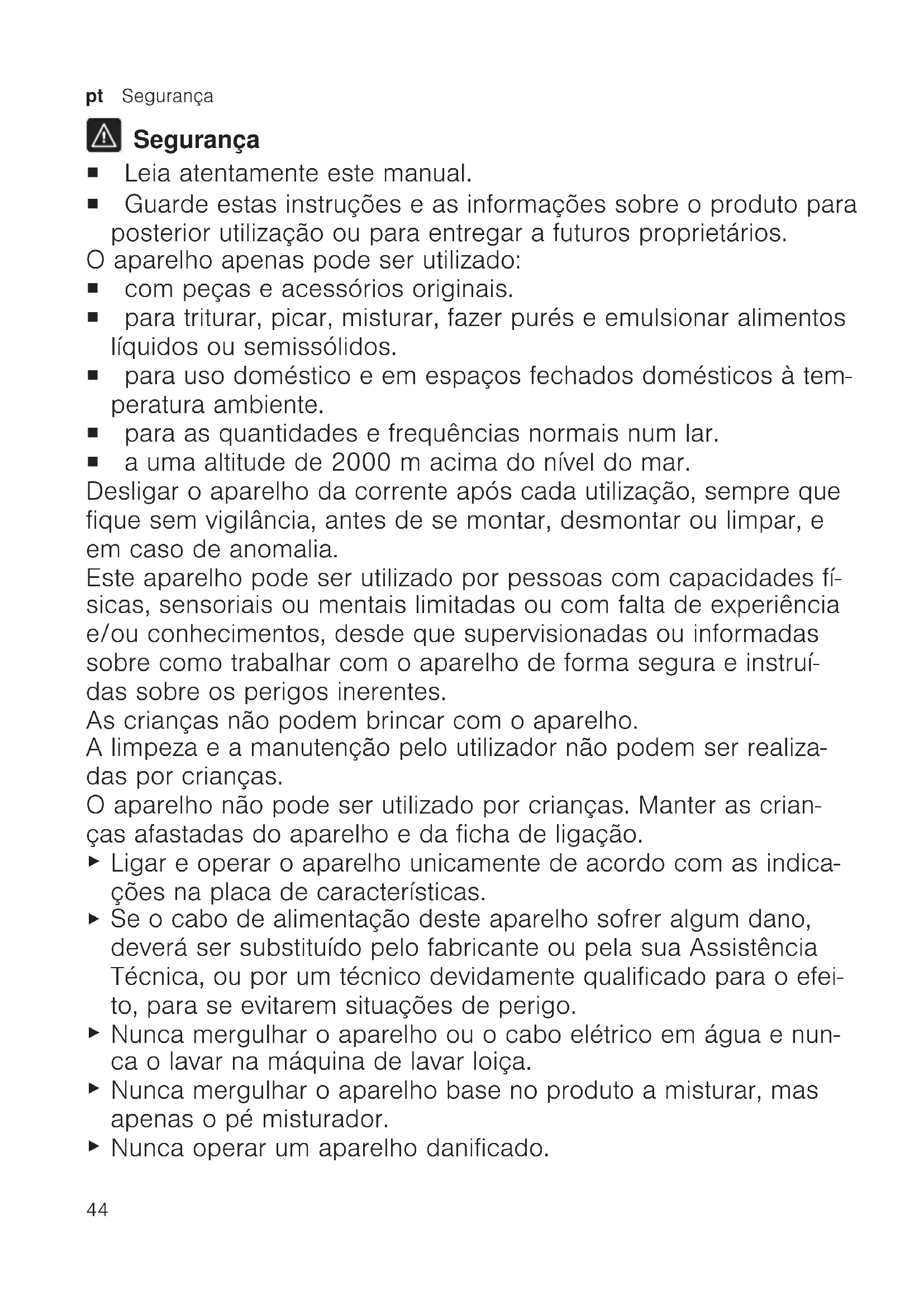 Segurança ¡ Leia atentamente este manual. ¡ Guarde estas instruções e as informações sobre o produto para posterior utilização ou para entregar a futuros proprietários. O aparelho apenas pode ser utilizado: ¡ com peças e acessórios originais. ¡ para triturar, picar, misturar, fazer purés e emulsionar alimentos líquidos ou semissólidos. ¡ para uso doméstico e em espaços fechados domésticos à tem- peratura ambiente. ¡ para as quantidades e frequências normais num lar. ¡ a uma altitude de 2000m acima do nível do mar. Desligar o aparelho da corrente após cada utilização, sempre que fique sem vigilância, antes de se montar, desmontar ou limpar, e em caso de anomalia. Este aparelho pode ser utilizado por pessoas com capacidades fí- sicas, sensoriais ou mentais limitadas ou com falta de experiência e/ou conhecimentos, desde que supervisionadas ou informadas sobre como trabalhar com o aparelho de forma segura e instruí- das sobre os perigos inerentes. As crianças não podem brincar com o aparelho. A limpeza e a manutenção pelo utilizador não podem ser realiza- das por crianças. O aparelho não pode ser utilizado por crianças. Manter as crian- ças afastadas do aparelho e da ficha de ligação.