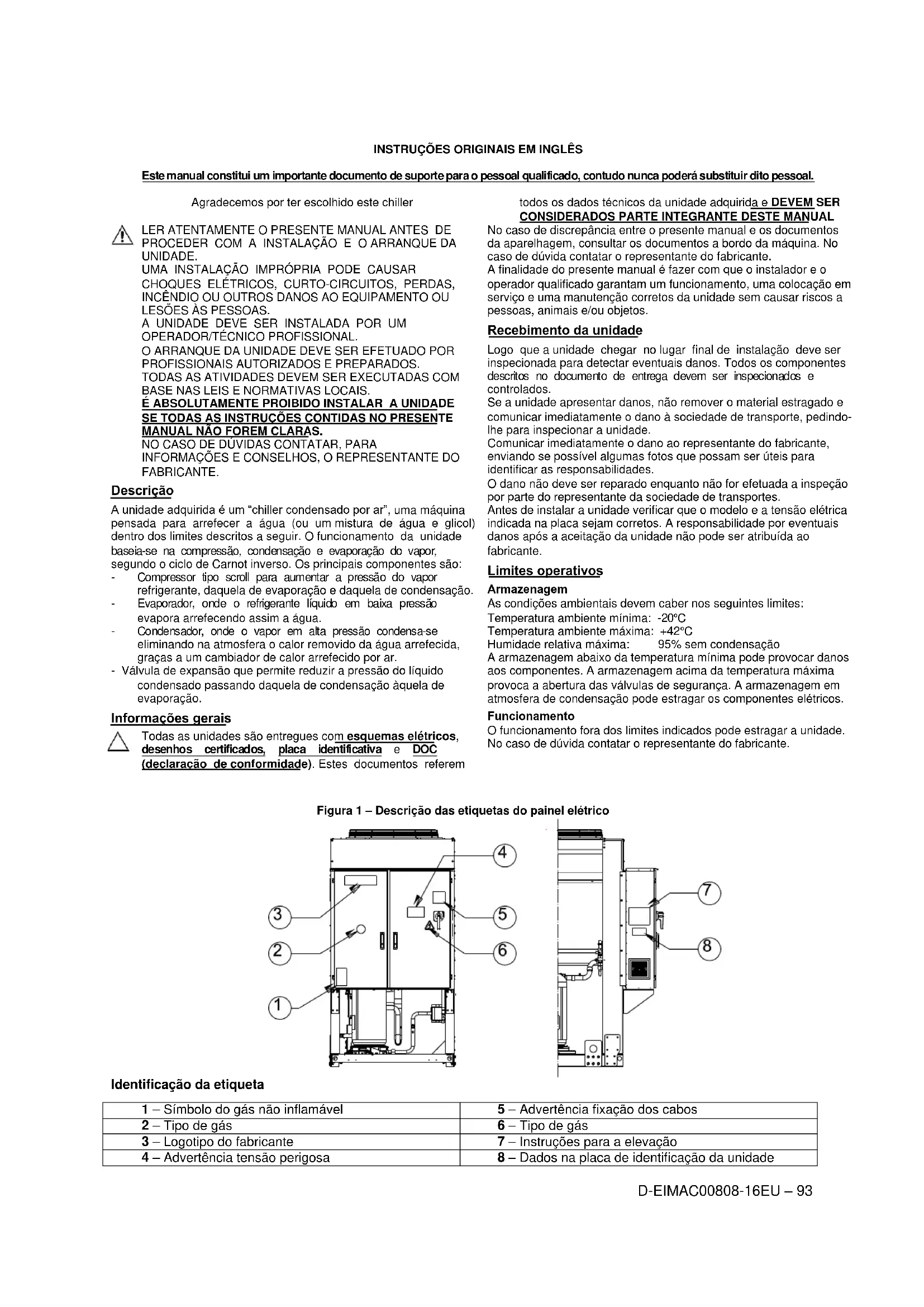 Figura 1 – Descrição das etiquetas do painel elétrico Identificação da etiqueta 1 – Símbolo do gás não inflamável 5 – Advertência fixação dos cabos 2 – Tipo de gás 6 – Tipo de gás 3 – Logotipo do fabricante 7 – Instruções para a elevação 4 – Advertência tensão perigosa 8 – Dados na placa de identificação da unidadeD-EIMAC00808-16EU –94