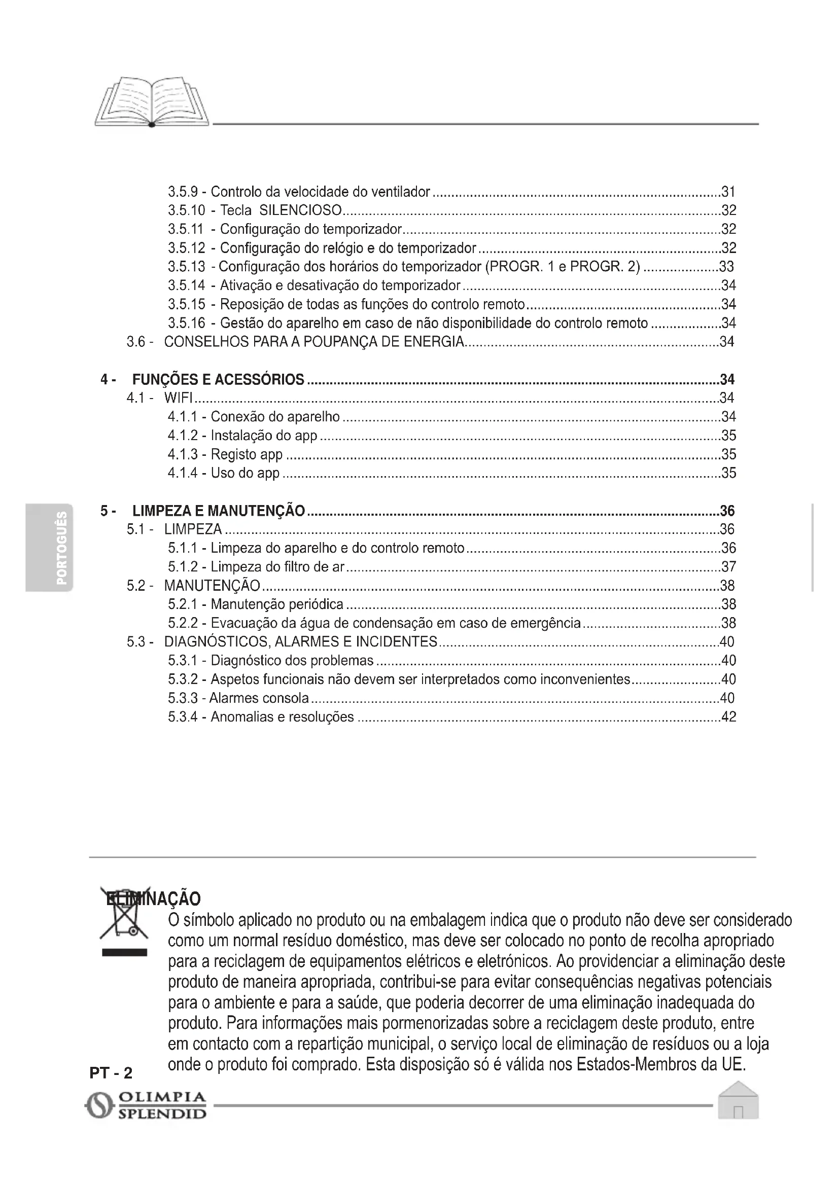- PT - 2 PORTOGUÊS ELIMINAÇÃO O símbolo aplicado no produto ou na embalagem indica que o produto não deve ser considerado como um normal resíduo doméstico, mas deve ser colocado no ponto de recolha apropriado para a reciclagem de equipamentos elétricos e eletrónicos. Ao providenciar a eliminação deste produto de maneira apropriada, contribui-se para evitar consequências negativas potenciais para o ambiente e para a saúde, que poderia decorrer de uma eliminação inadequada do produto. Para informações mais pormenorizadas sobre a reciclagem deste produto, entre em contacto com a repartição municipal, o serviço local de eliminação de resíduos ou a loja onde o produto foi comprado. Esta disposição só é válida nos Estados-Membros da UE. 3.5.9 - Controlo da velocidade do ventilador p. 31