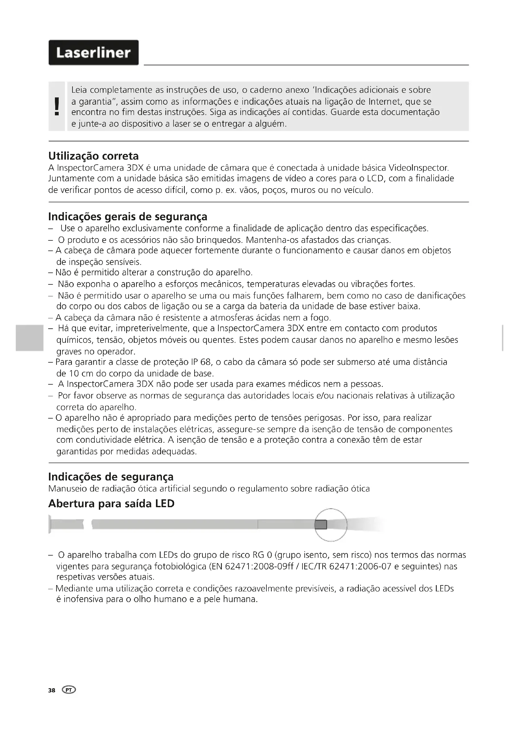 – O aparelho trabalha com LEDs do grupo de risco RG 0 (grupo isento, sem risco) nos termos das normas vigentes para segurança fotobiológica (EN 62471:2008-09ff / IEC/TR 62471:2006-07 e seguintes) nas respetivas versões atuais. – Mediante uma utilização correta e condições razoavelmente previsíveis, a radiação acessível dos LEDs é inofensiva para o olho humano e a pele humana. Abertura para saída LED Indicações de segurança Manuseio de radiação ótica artificial segundo o regulamento sobre radiação ótica Indicações gerais de segurança – Use o aparelho exclusivamente conforme a nalidade de aplicação dentro das especicações. – O produto e os acessórios não são brinquedos. Mantenha-os afastados das crianças. – A cabeça de câmara pode aquecer fortemente durante o funcionamento e causar danos em objetos de inspeção sensíveis. – Não é permitido alterar a construção do aparelho. – Não exponha o aparelho a esforços mecânicos, temperaturas elevadas ou vibrações fortes. – Não é permitido usar o aparelho se uma ou mais funções falharem, bem como no caso de danicações do corpo ou dos cabos de ligação ou se a carga da bateria da unidade de base estiver baixa. – A cabeça da câmara não é resistente a atmosferas ácidas nem a fogo. – Há que evitar, impreterivelmente, que a InspectorCamera 3DX entre em contacto com produtos químicos, tensão, objetos móveis ou quentes. Estes podem causar danos no aparelho e mesmo lesões graves no operador. – Para garantir a classe de proteção IP 68, o cabo da câmara só pode ser submerso até uma distância de 10 cm do corpo da unidade de base. – A InspectorCamera 3DX não pode ser usada para exames médicos nem a pessoas. – Por favor observe as normas de segurança das autoridades locais e/ou nacionais relativas à utilização correta do aparelho. – O aparelho não é apropriado para medições perto de tensões perigosas. Por isso, para realizar medições perto de instalações elétricas, assegure-se sempre da isenção de tensão de componentes com condutividade elétrica. A isenção de tensão e a proteção contra a conexão têm de estar garantidas por medidas adequadas. Utilização correta A InspectorCamera 3DX é uma unidade de câmara que é conectada à unidade básica VideoInspector. Juntamente com a unidade básica são emitidas imagens de vídeo a cores para o LCD, com a nalidade de vericar pontos de acesso difícil, como p.ex. vãos, poços, muros ou no veículo. Leia completamente as instruções de uso, o caderno anexo ‘Indicações adicionais e sobre a garantia”, assim como as informações e indicações atuais na ligação de Internet, que se encontra no fim destas instruções. Siga as indicações aí contidas. Guarde esta documentação e junte-a ao dispositivo a laser se o entregar a alguém. !InspectorCamera 3DX