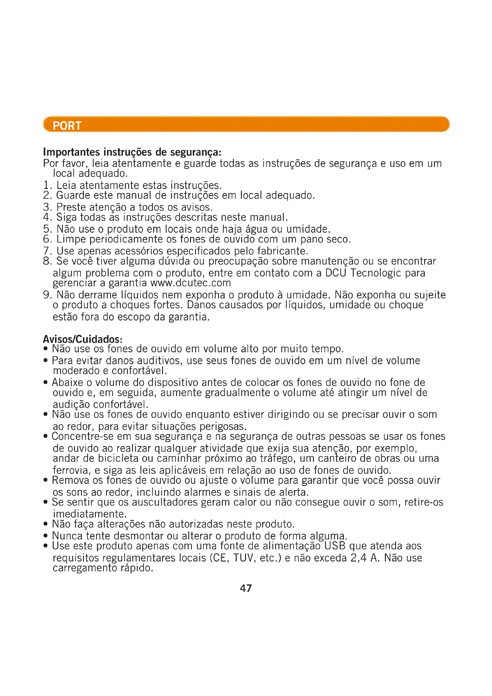 - Este produto contém material magnético. Por favor, mantenha o produto longe de produtos magnéticos sensíveis (como cartões de crédito e telas de vídeo) para evitar danos Segurança auditiva: Perigo Para evitar danos à sua audição, não ouça em volume alto por muito tempo. Ajuste o volume para uma faixa segura. Se o volume dos fones de ouvido for muito alto, o tempo de uso deve ser reduzido. Serviço pós-venda: Este produto é coberto pela garantia por um período de manutenção gratuita de 3 anos e políticas de devolução incondicional de 30 dias. Se você tiver algum problema de qualidade sobre o produto, entre em contato com a DCU Tecnologic em www.dcutec.com Parâmetros do produto: Versão Bluetooth: V5.0/5.2 Chipset: Bluetrum 8922E Crystal-Clear calling Cancelamento de ruído: FEEDFORWARD FF Profundidade de Redução de Ruído: -25~-28dB Distância de trabalho: 10-15m sem obstáculos Classificação à prova d'água: IPX5 Tempo de trabalho: Música 8h, tempo de conversação 8h (70% volume) Tempo de carregamento: estojo de carregamento 2h, fones de ouvido 1h Capacidade da bateria: 400mAh, fone de ouvido único 50mAh Alto-falantes: 10mm, 32Ω, S/N: ≥100dB Corrente de trabalho: 7mA PORT 48Importantes instruções de segurança: Por favor, leia atentamente e guarde todas as instruções de segurança e uso em um local adequado.