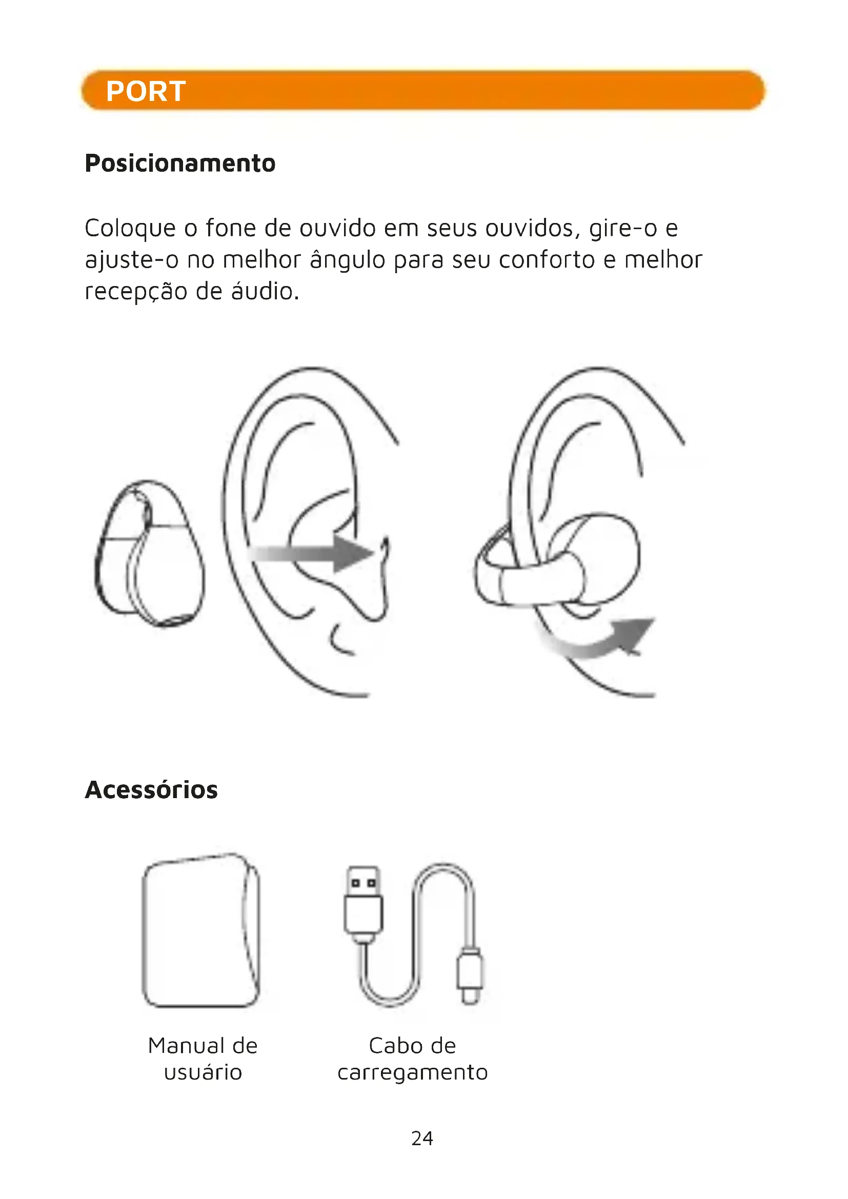 por estar a mais de 10 metros de distância ou existirem obstáculos entre eles, ele se reconectará automaticamente ao retornar à distância efetiva em 1 minuto. Redefinir o emparelhamento: Quando os fones de ouvido esquerdo e direito não estiverem emparelhados e ambos desconectados do telefone, pressione a área de toque dos dois fones de ouvido 4 vezes enquanto os fones de ouvido estiverem ligados e, em seguida, desligue-os para reiniciá-los com sucesso. Coloque os fones de ouvido esquerdo e direito de volta na caixa de carregamento, aguarde alguns segundos e retire os dois ao mesmo tempo. Os fones de ouvido se reconectarão automaticamente e agora você está pronto para conectá-los ao seu telefone celular. Controle de toque X4 X4 Modo de música Reproduzir/Pausar (E/D) x2 Música anterior (L) x3 Próxima música (R) x3 Modo de chamada Atender/desligar (L/R) x2 Pressione e segure 2s (L/R): Rejeitar Assistente de voz (Siri) (L/R) x4 27PORT Carregamento Fone de ouvido carregando: A luz vermelha dos fones de ouvido e a luz azul da caixa de carregamento estão acesas: carregando A luz vermelha do fone de ouvido está apagada: totalmente carregado O fone de ouvido está totalmente carregado após aproximadamente 1,5 horas. Carregamento de caixa: A luz vermelha da caixa de carregamento pisca: carregando A luz vermelha da caixa de carregamento está acesa: totalmente carregada A caixa de carregamento está totalmente carregada após cerca de 1,5 horas. Aviso