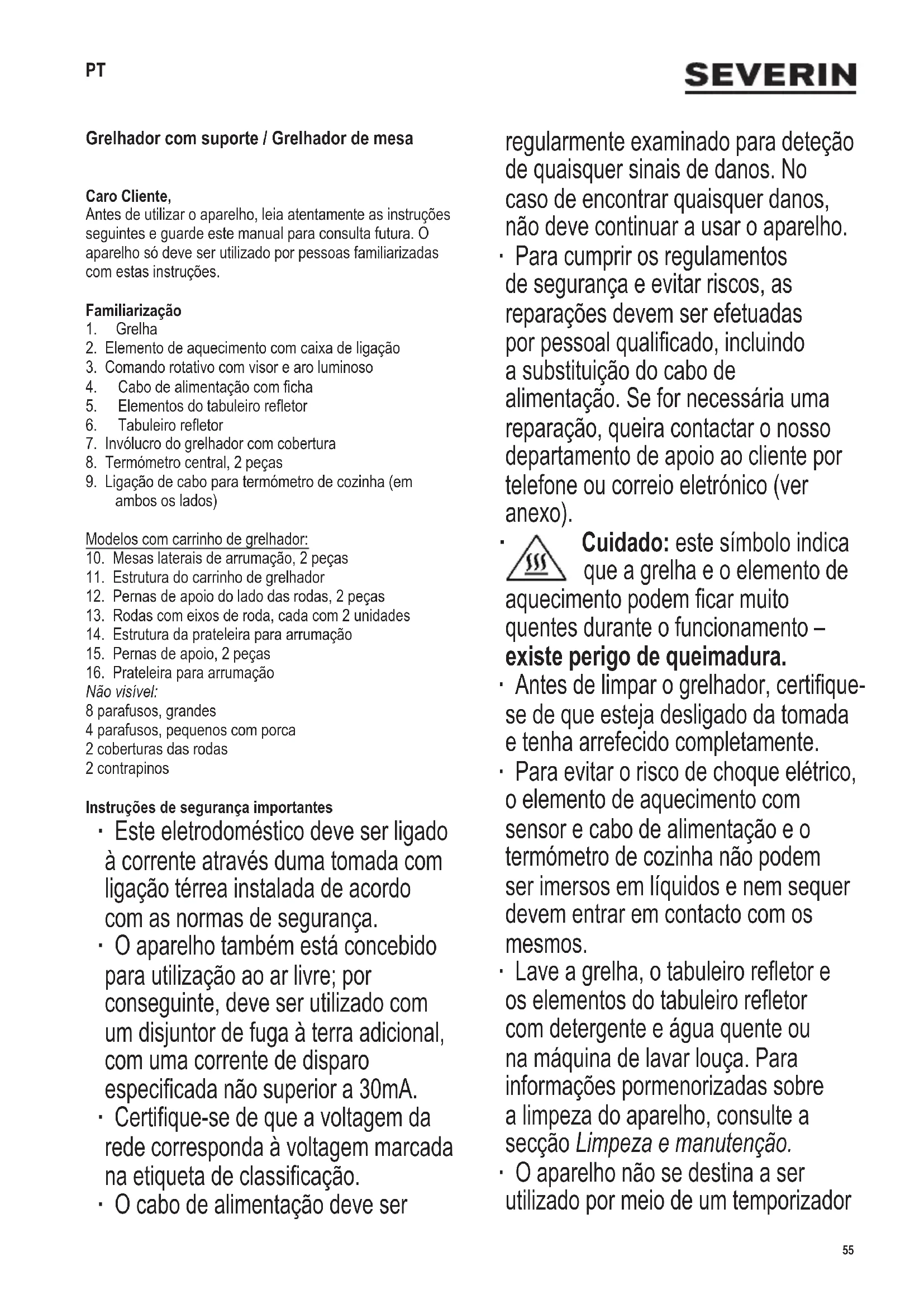 Cuidado: este símbolo indica que a grelha e o elemento de aquecimentopodemcarmuito quentes durante o funcionamento – existe perigo de queimadura. ∙ Antesdelimparogrelhador,certique- se de que esteja desligado da tomada e tenha arrefecido completamente. ∙ Para evitar o risco de choque elétrico, o elemento de aquecimento com sensor e cabo de alimentação e o termómetro de cozinha não podem ser imersos em líquidos e nem sequer devem entrar em contacto com os mesmos. ∙ Laveagrelha,otabuleiroreetore oselementosdotabuleiroreetor com detergente e água quente ou na máquina de lavar louça. Para informações pormenorizadas sobre a limpeza do aparelho, consulte a secção Limpeza e manutenção. ∙ O aparelho não se destina a ser utilizado por meio de um temporizador PT56 142 x 208 mm externo ou de um sistema de controlo remoto separado. ∙ Aviso! Em nenhuma circunstância use carvão ou qualquer outro combustível sólido ou líquido para fazer funcionar o grelhador. ∙ Cuidado: Não cubra a grelha com folha de alumínio, pratos de churrasco ou outros objetos, já que a acumulação de calor resultante poderia causar danos graves na grelha. ∙ Pode ser derramado um máximo de 2,0ldeáguanotabuleiroreetor. ∙ Este aparelho destina-se a aplicações domésticas ou semelhantes, como: - cozinhas para funcionários em lojas, escritórios e ambientes de trabalho semelhantes; - ambientes de trabalho agrícola; - utilização por clientes em hotéis, motéis e alojamentos similares; - ambientes do tipo “alojamento e pequeno-almoço”. ∙ Este aparelho pode ser utilizado por crianças (com pelo menos 8 anos de idade) e por pessoas com capacidades físicas, sensoriais ou mentais reduzidas ou que careçam de experiência e conhecimento, desde que sejam supervisionadas ou recebam instruções sobre a utilização do aparelho e compreendam plenamente todos os perigos e precauções de segurança envolvidos. ∙ As crianças devem ser vigiadas para assegurar que não brinquem com o aparelho. ∙ Não deve permitir que as tarefas de limpeza e manutenção sejam efetuadas por crianças, a menos que estas sejam supervisionadas e tenham pelo menos 8 anos de idade. ∙ O aparelho e o seu cabo de alimentação elétrica devem estar sempre fora do alcance das crianças com menos de 8 anos de idade. ∙ Cuidado: mantenha quaisquer materiais de embalagem bemafastadosdascrianças;existeriscodeasxia. ∙ Sempre que utilizar o aparelho, examine meticulosamente o corpo principal, incluindo o cabo de alimentação elétrica e qualquer acessório aplicado, em busca de possíveis falhas. Se, por exemplo, o aparelho tiver caído sobre uma superfície dura ou o seu cabo de alimentação elétrica tiver sido puxado com força excessiva, não deve continuar a utilizá-lo: até mesmo os danos invisíveis podem ter efeitos adversos sobre a segurança de funcionamento do aparelho. ∙ Durante a utilização, o grelhador de churrasco deve ser colocado numa superfície nivelada, resistente ao calor e impermeável a salpicos e manchas. Ao grelhar alimentos com elevado teor de gordura ou humidade, os salpicos nem sempre são evitáveis. ∙ Não posicione o grelhador junto a uma parede ou umcantoecertique-sedequenãosãoguardados materiaisinamáveisjuntoaele. ∙ Lembre-se que os alimentos com elevado teor de gordura ou humidade podem tender a incendiar-se; por conseguinte, encha sempre o tabuleiro reetor com água antes da utilização. Não ligue o grelhador à corrente antes de encher o tabuleiro com água. A água ajuda a arrefecerotabuleiroreetor,reduza emissão de fumos e também facilita a limpeza. ∙ Mantenha atenção ao nível da água. Deve ser acrescentada água conforme a necessidade, assegurando sempre que não entre em contacto com o elemento de aquecimento. Cuidado: desligue o grelhador da tomada antes de acrescentar água. ∙ Antes de utilizar o grelhador, verique sempre se o elemento de aquecimento está corretamente ajustado ao invólucro e ao tabuleiro reetor. ∙ Durante a utilização, o grelhador de churrasco deve estar permanentemente sob vigilância. ∙ Mantenha o cabo elétrico longe de qualquer parte aquecida do aparelho. ∙ Encaminhe o cabo elétrico por forma a que ninguém possa tropeçar nele. ∙ Retire sempre a cha da tomada - antes de encher com água; - no nal de cada utilização; - no caso de mau funcionamento;57 142 x 208 mm - antes de limpar o aparelho. ∙ A utilização de uma extensão elétrica ou de um enrolador causa uma perda de potência, possivelmente combinada com uma subsequente acumulação de calor no cabo. Por conseguinte, é necessário desenrolar completamenteocaboantesdautilização.Certique-se de que o cabo esteja aprovado para utilização ao ar livreeparaapotênciaespecicada(veraetiquetade classicação). ∙ Não desloque o carrinho de grelhador empurrando a mesa lateral. Comece por retirar a mesa lateral e agarre sempre a estrutura. ∙ Não utilize o carrinho do grelhador para transportar objetos. ∙ Nunca mover o grelhador enquanto este estiver em funcionamento. ∙ Retirar a água após a sua utilização. ∙ Cuidado! Permitir sempre que o grelhador arrefeça completamente antes de o mover, limpar, cobrir ou armazenar. ∙ Cuidado! Quando o grelhador não estiver a ser utilizado, o elemento de aquecimento com caixa terminal deve ser removido do grelhador e armazenado em divisão interior seca. ∙ As restantes peças do grelhador não devem ser mantidas ao ar livre ou em locais abertos onde possam ser afetadas pelas condições meteorológicas. ∙ O grelhador apenas deve ser utilizado com o termómetro central fornecido ou com o SEVERIN art.º n.º ZB 8126. ∙ Declinamos qualquer responsabilidade se a avaria resultar de uso indevido, ou se não forem respeitadas as instruções. ∙ Este produto encontra-se em conformidade com todas as diretivas comunitárias referentes a rotulagem. Antes da primeira utilização ∙ Retire quaisquer mater