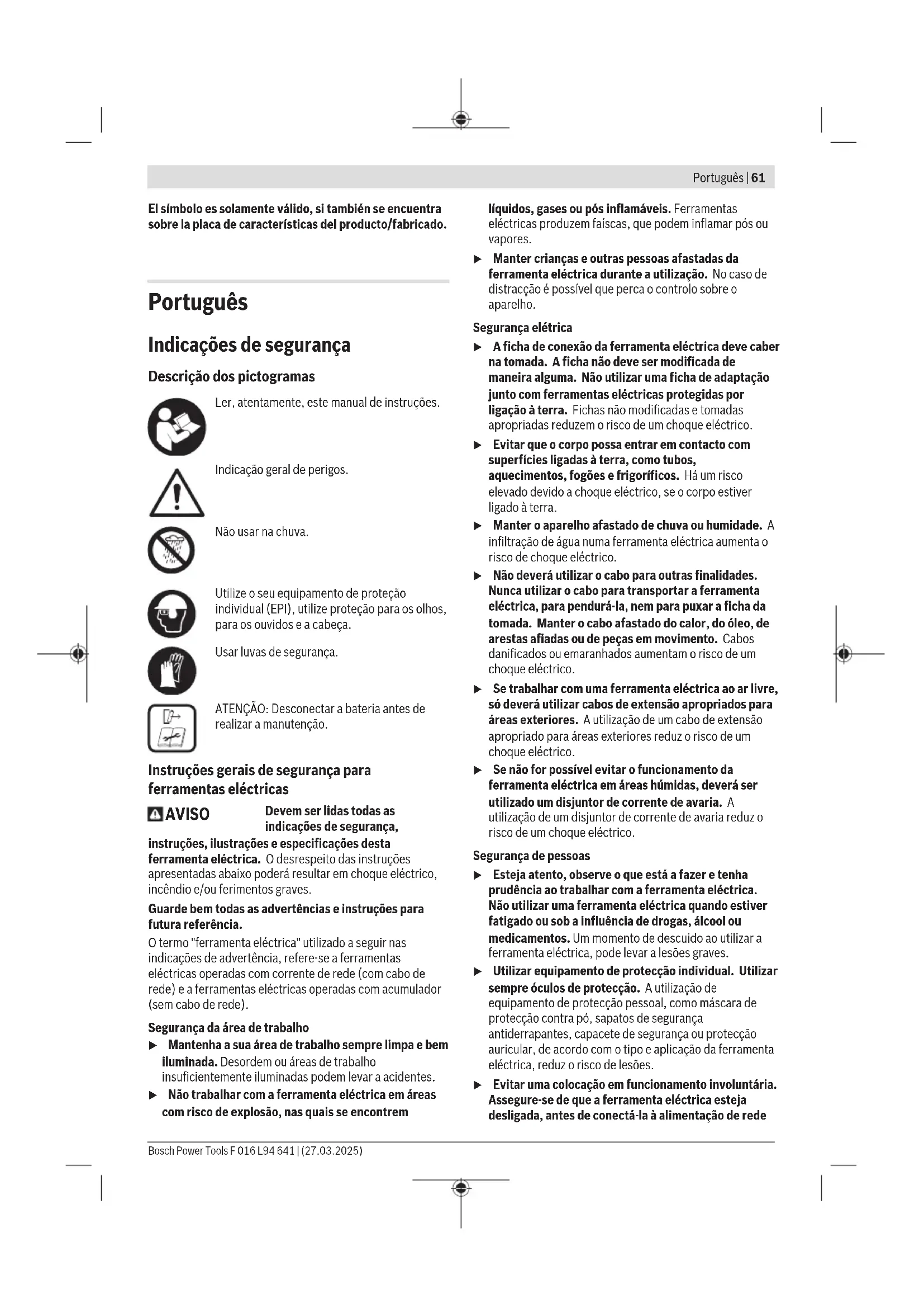 V 18 Altura de trabalho m 2,4 − 2,9 Velocidade da corrente na marcha em vazio m/s 7,7 Bosch Power Tools F 016 L94 641 | (27.03.2025)66 | Português Podador telescópico GKE 18V-25 TP Comprimento da barra cm 25 Barra compatível Oregon 1 619 P19 527 Bosch F 016 F06 545 Tipo de corrente de serra .325"– 80BX Passo de corrente de serra 0.325" perfil baixo Espessura do elo de acionamento mm 1,1 Número de elos de acionamento 46 Máx. diâmetro de corte cm 23 Volume do tanque de óleo ml 80 Lubrificação automática da corrente ● Tensionamento da corrente com ferramenta ● Estrela de desvio ● Peso