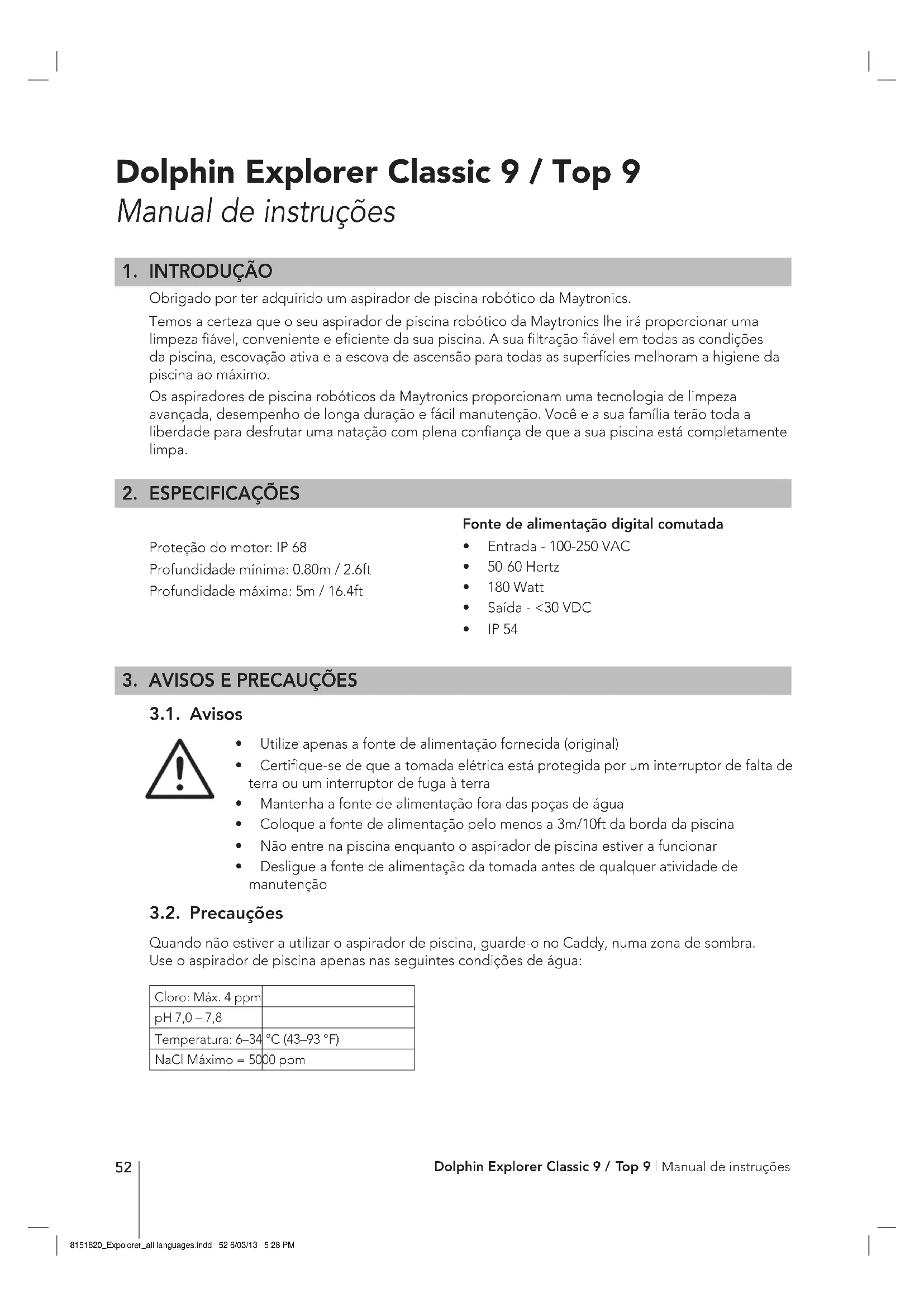 - IP 54 8151620_Expolorer_all languages.indd 52 6/03/13 5:28 PM53 Dolphin Explorer Classic 9 / Top 9 | Manual de instruções Dolphin Deluxe 4/5 Dolphin Explorer Classic 9 Escova combinada Escova que limpa todas as superfícies, ideal para a maioria das piscinas. Escova de PVC para betão, PVC, fibra de vidro e revestimento. Escova Wonder para cerâmica lisa. Escovas opcionais Unidade de controlo remoto Escovas opcionais Escovas Fonte de alimentação Dolphin Explorer Top 9 Filtração Cartuchos com filtro de rede (X4) Filtro ultrafino (X4) (opcional) Escova combinada Escova que limpa todas as superfícies, ideal para a maioria das piscinas. Escova de PVC para betão, PVC, fibra de vidro e revestimento. Escova Wonder para cerâmica lisa.