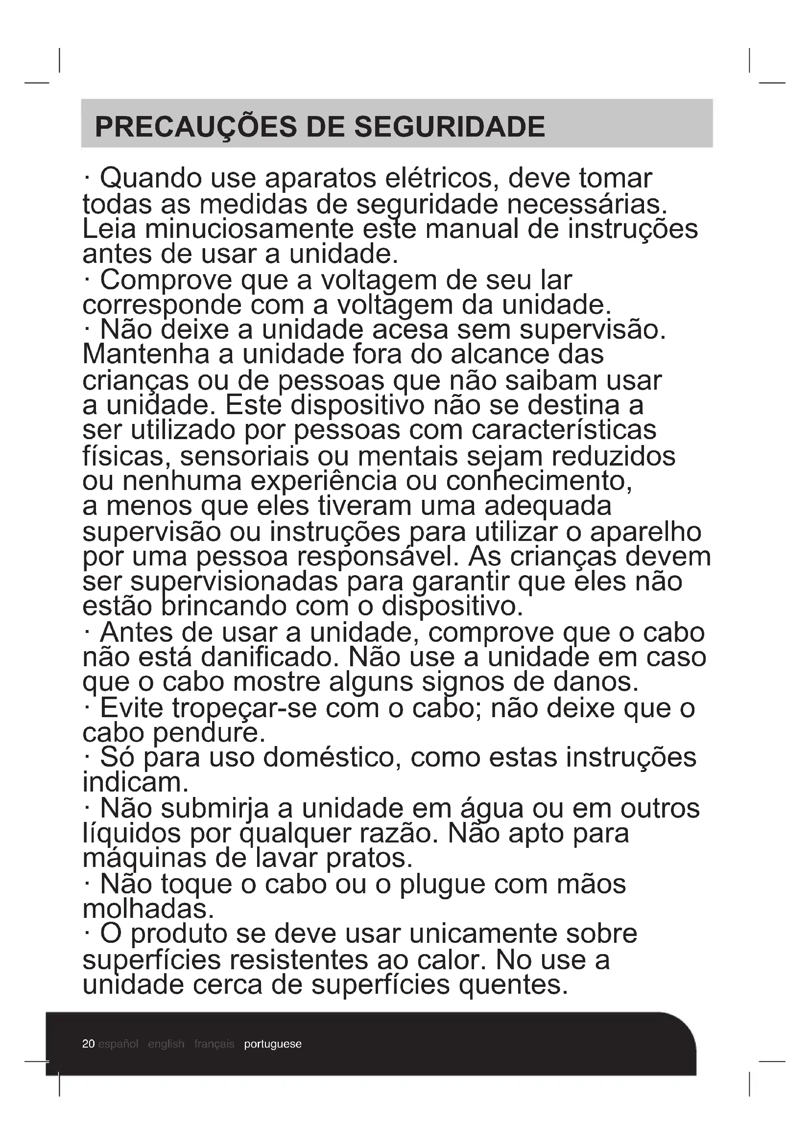 - O produto se deve usar unicamente sobre superfícies resistentes ao calor. No use a unidade cerca de superfícies quentes.21español english français portuguese