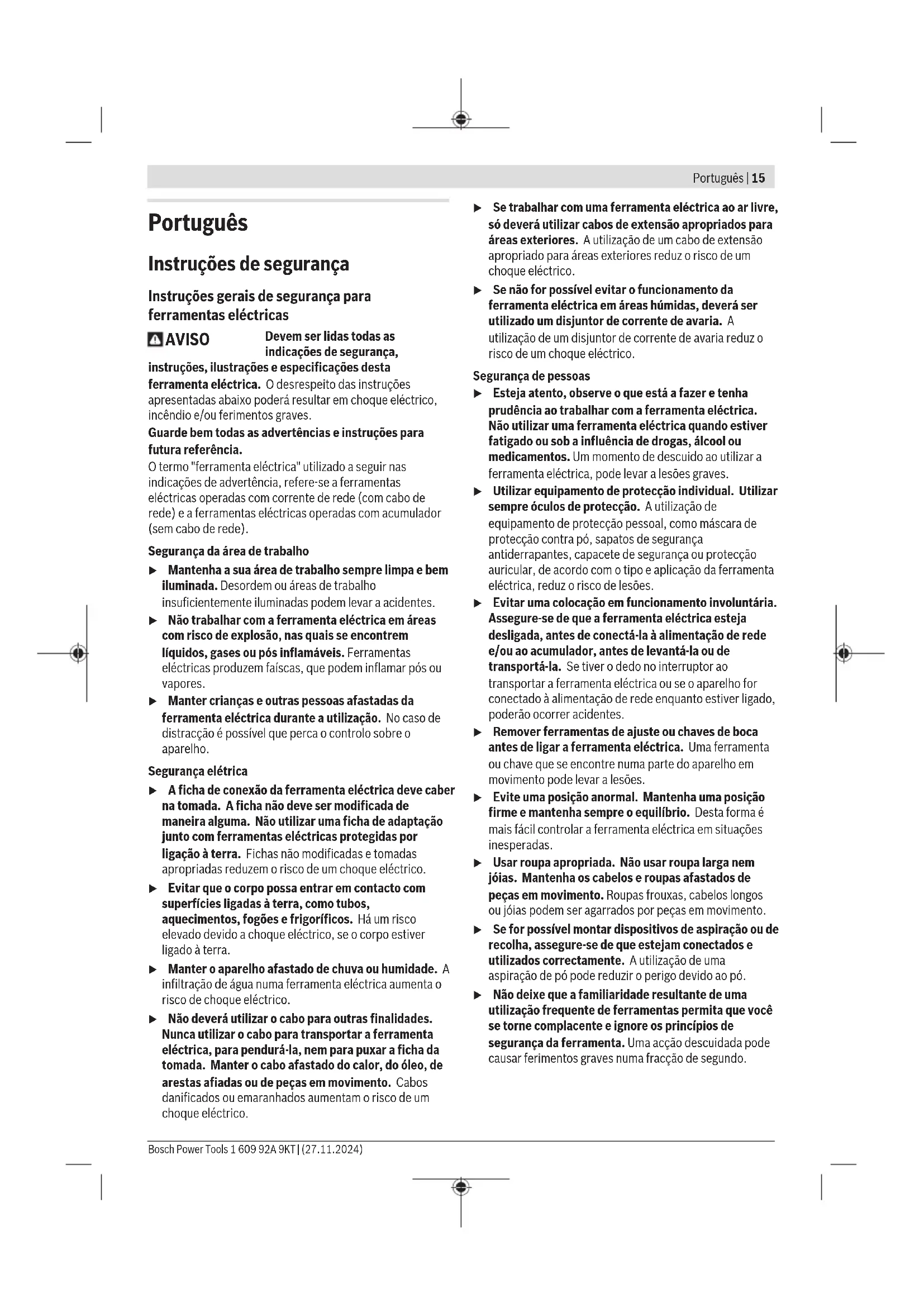 Remarque: Le graphique représenté ci-contre pour la présélection de mode n’indique pas les valeurs réelles. Il sert uniquement de réfé- rence. Entretien et Service après‑vente Nettoyage et entretien u Retirez systématiquement la batterie avant toute in- tervention sur l’outil électroportatif (maintenance, changement d’accessoire, etc.). Il y a sinon risque de blessure si vous appuyez par mégarde sur l’interrupteur Marche/Arrêt. u Toujours tenir propres l’outil électroportatif ainsi que les fentes de ventilation afin d’obtenir un travail im- peccable et sûr. Service après-vente et conseil utilisateurs Notre Service Après-Vente répond à vos questions concer- nant la réparation et l’entretien de votre produit et les pièces de rechange. Des vues éclatées ainsi que des informations concernant les pièces de rechange se trouvent également sous: www.bosch‑pt.com L’équipe de conseil utilisateurs Bosch se tient à votre dispo- sition pour répondre à vos questions concernant nos pro- duits et leurs accessoires. Pour toute demande de renseignement ou commande de pièces de rechange, nous préciser impérativement le numé- ro d’article à dix chiffres indiqué sur la plaque signalétique du produit. Maroc Robert Bosch Morocco SARL 53, Rue Lieutenant Mahroud Mohamed 20300 Casablanca Tel.: +212529314327 E-Mail: sav.outillage@ma.bosch.com Vous trouverez d’autres adresses de service sous: www.bosch-pt.com/serviceaddresses Transport Les batteries Lithium-ion recommandées sont soumises aux règlements de transport des matières dangereuses. L’utilisa- teur peut transporter les batteries par voie routière sans me- sures supplémentaires. Lors d’une expédition par tiers (par ex.: transport aérien ou entreprise de transport), les mesures à prendre spécifiques à l’emballage et au marquage doivent être observées. Dans un tel cas, lors de la préparation de l’envoi, il est impératif de faire appel à un expert en transport des matières dange- reuses. N’expédiez les accumulateurs que si le carter n’est pas en- dommagé. Recouvrez les contacts à l’air libre et emballez l’accu de manière à ce qu’il ne se déplace pas dans l’embal- lage. Veuillez également respecter les réglementations sup- plémentaires éventuellement en vigueur dans votre pays. Élimination des déchets Les outils électroportatifs, les accus ainsi que leurs accessoires et emballages doivent être rapportés dans un centre de recyclage respec- tueux de l’environnement. Ne jetez pas les outils électroportatifs et les ac- cus/piles avec les ordures ménagères! Accus/piles : Li-Ion : Veuillez respecter les indications se trouvant dans le cha- pitre Transport (voir «Transport», Page14). 1 609 92A 9KT | (27.11.2024) Bosch Power ToolsPortuguês | 15 Português Instruções de segurança Instruções gerais de segurança para ferramentas eléctricas AVISO Devem ser lidas todas as indicações de segurança, instruções, ilustrações e especificações desta ferramenta eléctrica. O desrespeito das instruções apresentadas abaixo poderá resultar em choque eléctrico, incêndio e/ou ferimentos graves. Guarde bem todas as advertências e instruções para futura referência. O termo "ferramenta eléctrica" utilizado a seguir nas indicações de advertência, refere‑se a ferramentas eléctricas operadas com corrente de rede (com cabo de rede) e a ferramentas eléctricas operadas com acumulador (sem cabo de rede). Segurança da área de trabalho u Mantenha a sua área de trabalho sempre limpa e bem iluminada. Desordem ou áreas de trabalho insuficientemente iluminadas podem levar a acidentes. u Não trabalhar com a ferramenta eléctrica em áreas com risco de explosão, nas quais se encontrem líquidos, gases ou pós inflamáveis. Ferramentas eléctricas produzem faíscas, que podem inflamar pós ou vapores. u Manter crianças e outras pessoas afastadas da ferramenta eléctrica durante a utilização. No caso de distracção é possível que perca o controlo sobre o aparelho. Segurança elétrica u A ficha de conexão da ferramenta eléctrica deve caber na tomada. A ficha não deve ser modificada de maneira alguma. Não utilizar uma ficha de adaptação junto com ferramentas eléctricas protegidas por ligação à terra. Fichas não modificadas e tomadas apropriadas reduzem o risco de um choque eléctrico. u Evitar que o corpo possa entrar em contacto com superfícies ligadas à terra, como tubos, aquecimentos, fogões e frigoríficos. Há um risco elevado devido a choque eléctrico, se o corpo estiver ligado à terra. u Manter o aparelho afastado de chuva ou humidade. A infiltração de água numa ferramenta eléctrica aumenta o risco de choque eléctrico. u Não deverá utilizar o cabo para outras finalidades. Nunca utilizar o cabo para transportar a ferramenta eléctrica, para pendurá‑la, nem para puxar a ficha da tomada. Manter o cabo afastado do calor, do óleo, de arestas afiadas ou de peças em movimento. Cabos danificados ou emaranhados aumentam o risco de um choque eléctrico. u Se trabalhar com uma ferramenta eléctrica ao ar livre, só deverá utilizar cabos de extensão apropriados para áreas exteriores. A utilização de um cabo de extensão apropriado para áreas exteriores reduz o risco de um choque eléctrico. u Se não for possível evitar o funcionamento da ferramenta eléctrica em áreas húmidas, deverá ser utilizado um disjuntor de corrente de avaria. A utilização de um disjuntor de corrente de avaria reduz o risco de um choque eléctrico. Segurança de pessoas u Esteja atento, observe o que está a fazer e tenha prudência ao trabalhar com a ferramenta eléctrica. Não utilizar uma ferramenta eléctrica quando estiver fatigado ou sob a influência de drogas, álcool ou medicamentos. Um momento de descuido ao utilizar a ferramenta eléctrica, pode levar a lesões graves. u Utilizar equipamento de protecção individual. Utilizar se
