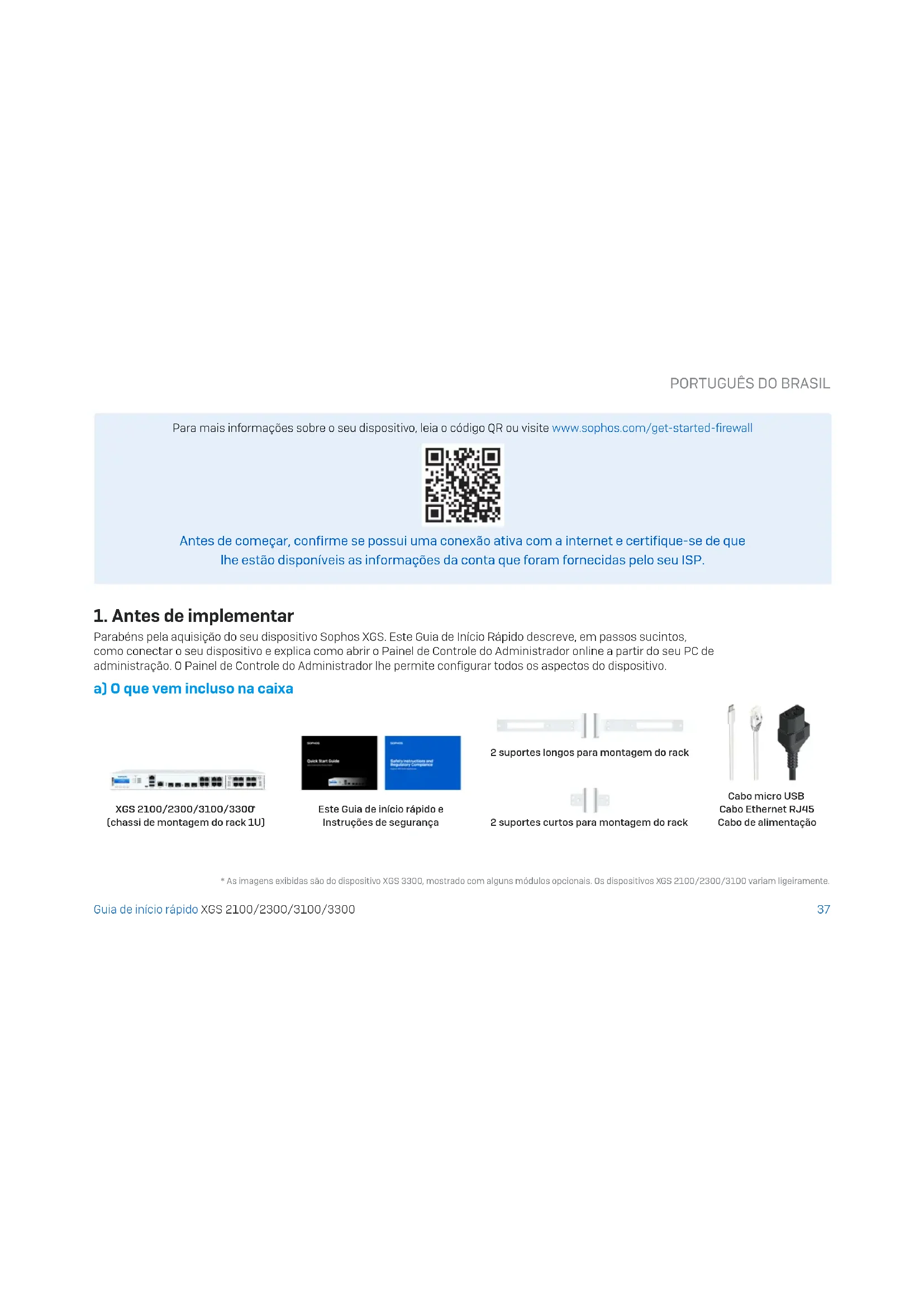Parabens pela aquisicao do seu dispositivo Sophos XGS. Este Guia de Inicio Rapidode sorce, em passos sucintos, como conectar o seu dispositivo e explicao como abrir o Paine de Controle do Adminstrador online a partir do seu PC de administracao. O Paine de Controle do Adminstrador Ihe permite configurar todos os aspectos do dispositivo.