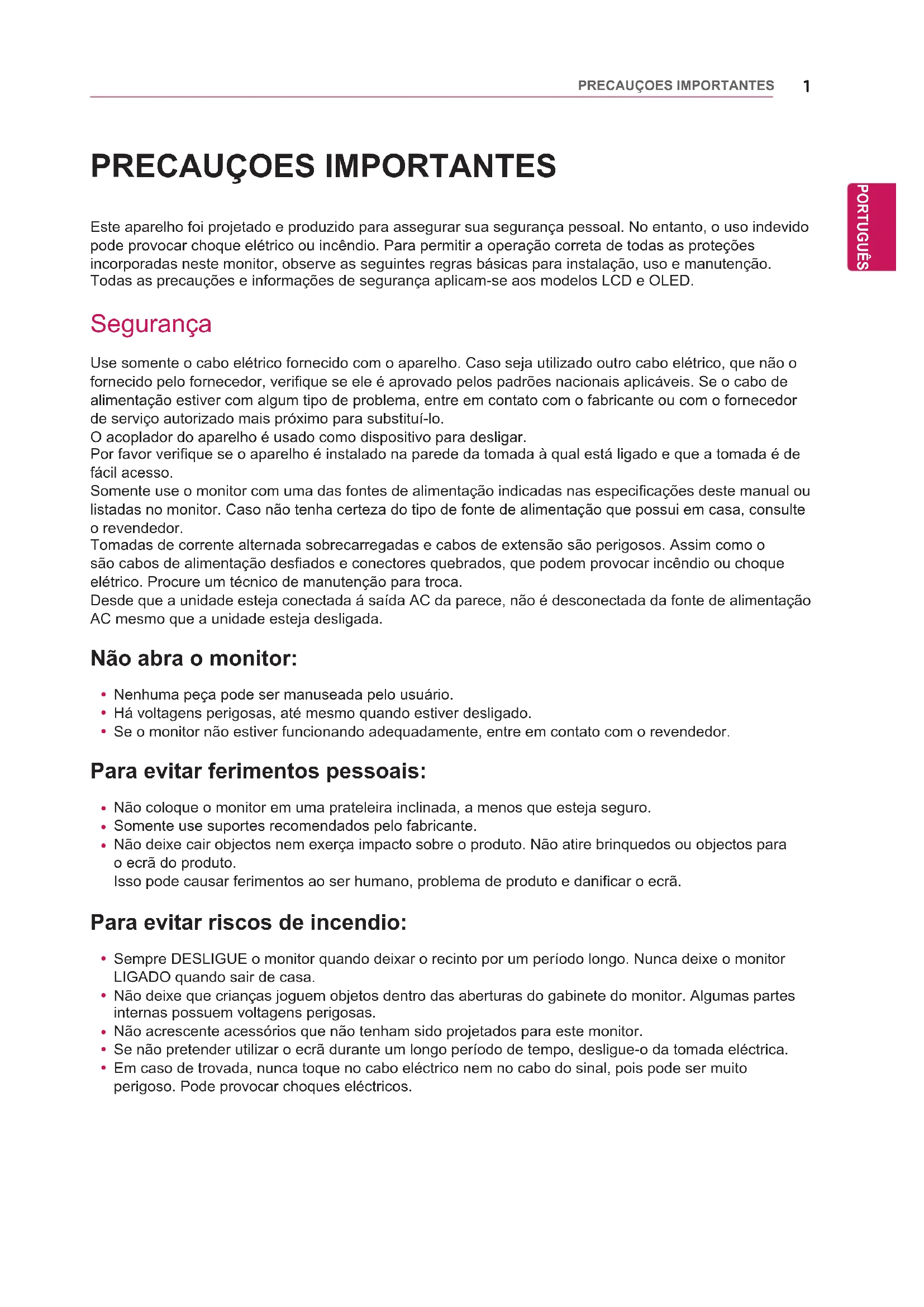 Este aparelho foi projetado e produzido para assegurar sua segurança pessoal. No entanto, o uso indevido pode provocar choque elétrico ou incêndio. Para permitir a operação correta de todas as proteções incorporadas neste monitor, observe as seguintes regras básicas para instalação, uso e manutenção. Todas as precauções e informações de segurança aplicam-se aos modelos LCD e OLED. Segurança Use somente o cabo elétrico fornecido com o aparelho. Caso seja utilizado outro cabo elétrico, que não o fornecido pelo fornecedor, verifique se ele é aprovado pelos padrões nacionais aplicáveis. Se o cabo de alimentação estiver com algum tipo de problema, entre em contato com o fabricante ou com o fornecedor de serviço autorizado mais próximo para substituí-lo.O acoplador do aparelho é usado como dispositivo para desligar.Por favor verifique se o aparelho é instalado na parede da tomada à qual está ligado e que a tomada é de fácil acesso.Somente use o monitor com uma das fontes de alimentação indicadas nas especificações deste manual ou listadas no monitor. Caso não tenha certeza do tipo de fonte de alimentação que possui em casa, consulte o revendedor.Tomadas de corrente alternada sobrecarregadas e cabos de extensão são perigosos. Assim como o são cabos de alimentação desfiados e conectores quebrados, que podem provocar incêndio ou choque elétrico. Procure um técnico de manutenção para troca.Desde que a unidade esteja conectada á saída AC da parece, não é desconectada da fonte de alimentação AC mesmo que a unidade esteja desligada. Não abra o monitor: