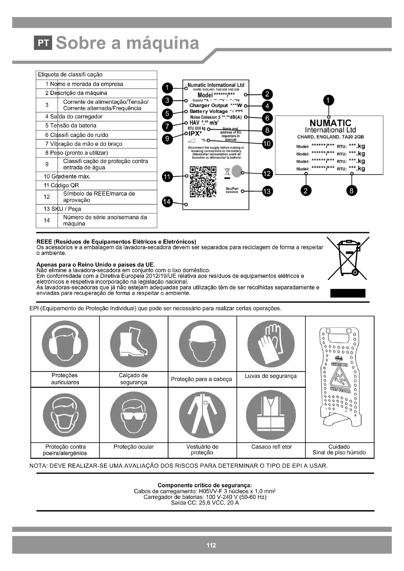 Carregador de baterias: 100 V-240 V (50-60 Hz) Saída CC: 25,6 VCC, 20 A REEE (Resíduos de Equipamentos Elétricos e Eletrónicos) Os acessórios e a embalagem da lavadora-secadora devem ser separados para reciclagem de forma a respeitar o ambiente. Apenas para o Reino Unido e países da UE. Não elimine a lavadora-secadora em conjunto com o lixo doméstico. Em conformidade com a Diretiva Europeia 2012/19/UE relativa aos resíduos de equipamentos elétricos e eletrónicos e respetiva incorporação na legislação nacional. As lavadoras-secadoras que já não estejam adequadas para utilização têm de ser recolhidas separadamente e enviadas para recuperação de forma a respeitar o ambiente. Etiqueta de classi cação 1 Nome e morada da empresa 2 Descrição da máquina
