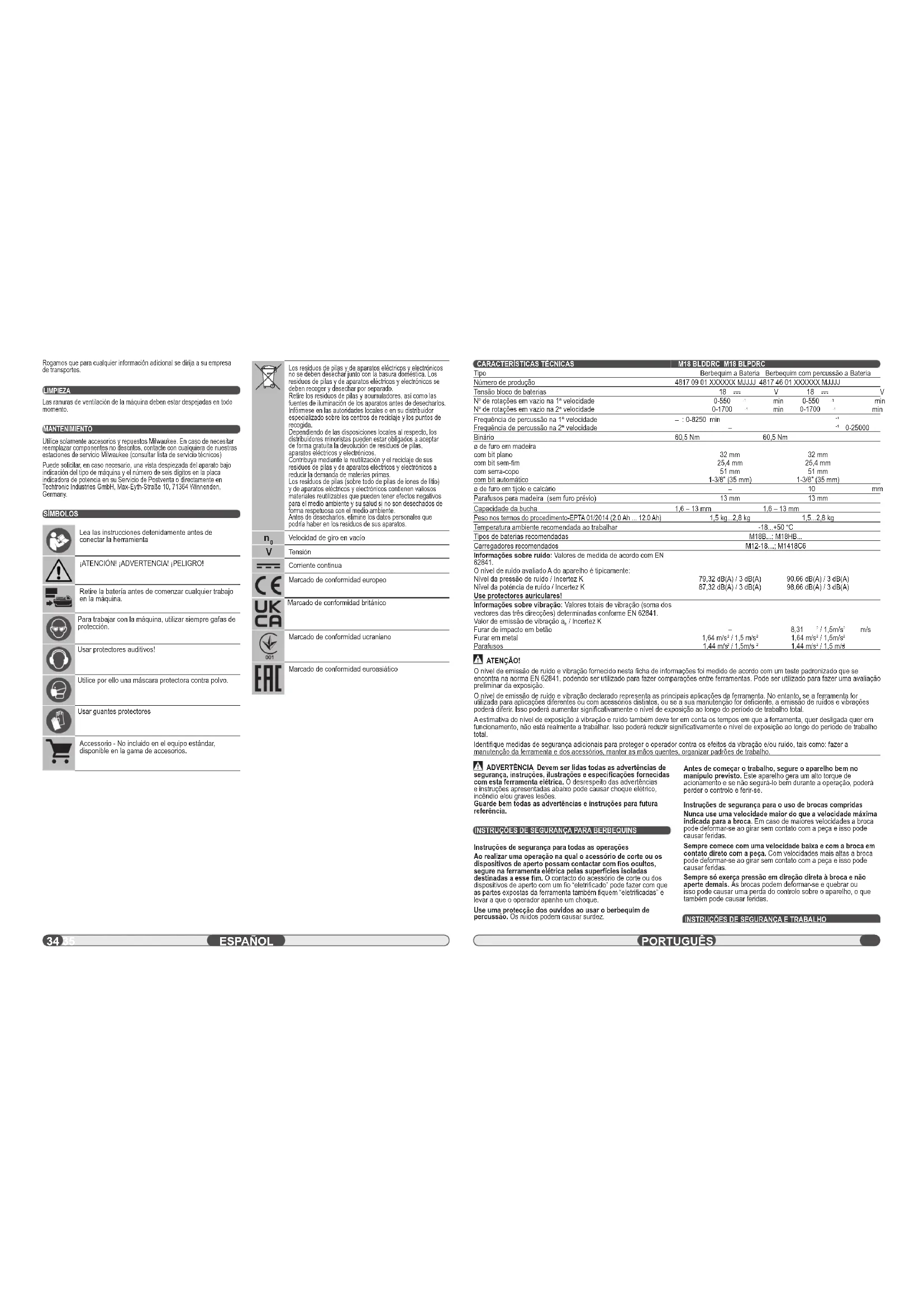 / Incertez K Furar de impacto em betão Furar em metal Parafusos ADVERTÊNCIA Devem ser lidas todas as advertências de segurança, instruções, ilustrações e especifi cações fornecidas com esta ferramenta elétrica. O desrespeito das advertências e instruções apresentadas abaixo pode causar choque elétrico, incêndio e/ou graves lesões. Guarde bem todas as advertências e instruções para futura referência. INSTRUÇÕES DE SEGURANÇA PARA BERBEQUINS Instruções de segurança para todas as operações Ao realizar uma operação na qual o acessório de corte ou os dispositivos de aperto possam contactar com fi os ocultos, segure na ferramenta elétrica pelas superfícies isoladas destinadas a esse fi m. O contacto do acessório de corte ou dos dispositivos de aperto com um fi o “eletrifi cado” pode fazer com que as partes expostas da ferramenta também fi quem “eletrifi cadas” e levar a que o operador apanhe um choque. Use uma protecção dos ouvidos ao usar o berbequim de percussão. Os ruídos podem causar surdez. Antes de começar o trabalho, segure o aparelho bem no manípulo previsto. Este aparelho gera um alto torque de acionamento e se não segurá-lo bem durante a operação, poderá perder o controlo e ferir-se. Instruções de segurança para o uso de brocas compridas Nunca use uma velocidade maior do que a velocidade máxima indicada para a broca. Em caso de maiores velocidades a broca pode deformar-se ao girar sem contato com a peça e isso pode causar feridas. Sempre comece com uma velocidade baixa e com a broca em contato direto com a peça. Com velocidades mais altas a broca pode deformar-se ao girar sem contato com a peça e isso pode causar feridas. Sempre só exerça pressão em direção direta à broca e não aperte demais. As brocas podem deformar-se e quebrar ou isso pode causar uma perda do controlo sobre o aparelho, o que também pode causar feridas. INSTRUÇÕES DE SEGURANÇA E TRABALHO ATENÇÃO! O nível de emissão de ruído e vibração fornecido nesta fi cha de informações foi medido de acordo com um teste padronizado que se encontra na norma EN 62841, podendo ser utilizado para fazer comparações entre ferramentas. Pode ser utilizado para fazer uma avaliação preliminar da exposição. O nível de emissão de ruído e vibração declarado representa as principais aplicações da ferramenta. No entanto, se a ferramenta for utilizada para aplicações diferentes ou com acessórios distintos, ou se a sua manutenção for defi ciente, a emissão de ruídos e vibrações poderá diferir. Isso poderá aumentar signifi cativamente o nível de exposição ao longo do período de trabalho total. A estimativa do nível de exposição à vibração e ruído também deve ter em conta os tempos em que a ferramenta, quer desligada quer em funcionamento, não está realmente a trabalhar. Isso poderá reduzir signifi cativamente o nível de exposição ao longo do período de trabalho total. Identifi que medidas de segurança adicionais para proteger o operador contra os efeitos da vibração e/ou ruído, tais como: fazer a manutenção da ferramenta e dos acessórios, manter as mãos quentes, organizar padrões de trabalho. Rogamos que para cualquier información adicional se dirija a su empresa de transportes. LIMPIEZA Las ranuras de ventilación de la máquina deben estar despejadas en todo momento. MANTENIMIENTO Utilice solamente accesorios y repuestos Milwaukee. En caso de necesitar reemplazar componentes no descritos, contacte con cualquiera de nuestras estaciones de servicio Milwaukee (consultar lista de servicio técnicos) Puede solicitar, en caso necesario, una vista despiezada del aparato bajo indicación del tipo de máquina y el número de seis dígitos en la placa indicadora de potencia en su Servicio de Postventa o directamente en Techtronic Industries GmbH, Max-Eyth-Straße 10, 71364 Winnenden, Germany. SÍMBOLOS Lea las instrucciones detenidamente antes de conectar la herramienta ¡ATENCIÓN! ¡ADVERTENCIA! ¡PELIGRO! Retire la batería antes de comenzar cualquier trabajo en la máquina. Para trabajar con la máquina, utilizar siempre gafas de protección. Usar protectores auditivos! Utilice por ello una máscara protectora contra polvo. Usar guantes protectores Accessorio - No incluido en el equipo estándar, disponible en la gama de accesorios. Los residuos de pilas y de aparatos eléctricos y electrónicos no se deben desechar junto con la basura doméstica. Los residuos de pilas y de aparatos eléctricos y electrónicos se deben recoger y desechar por separado. Retire los residuos de pilas y acumuladores, así como las fuentes de iluminación de los aparatos antes de desecharlos. Infórmese en las autoridades locales o en su distribuidor especializado sobre los centros de reciclaje y los puntos de recogida. Dependiendo de las disposiciones locales al respecto, los distribuidores minoristas pueden estar obligados a aceptar de forma gratuita la devolución de residuos de pilas, aparatos eléctricos y electrónicos. Contribuya mediante la reutilización y el reciclaje de sus residuos de pilas y de aparatos eléctricos y electrónicos a reducir la demanda de materias primas. Los residuos de pilas (sobre todo de pilas de iones de litio) y de aparatos eléctricos y electrónicos contienen valiosos materiales reutilizables que pueden tener efectos negativos para el medio ambiente y su salud si no son desechados de forma respetuosa con el medio ambiente. Antes de desecharlos, elimine los datos personales que podría haber en los residuos de sus aparatos.