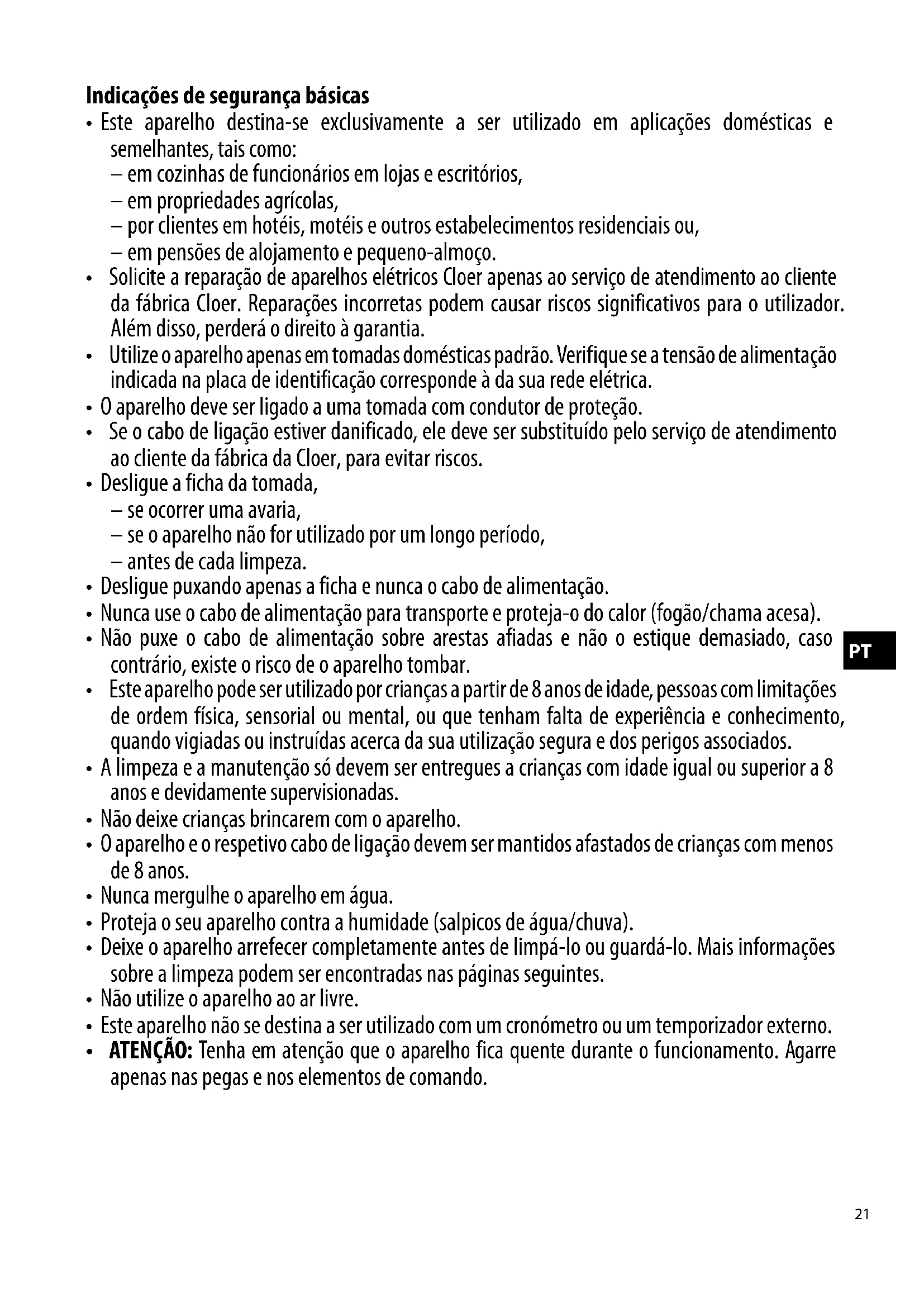 viço técnico da Cloer. Os electrodomésticos da Cloer cumprem as Directivas da CE e normas de segurança mais recentes. Garantia do fabricante Registe o seu aparelho dentro de 6 meses após a com- pra para poder usufruir da nossa garantia de fabrican- te. São aplicáveis as condições de garantia publicadas no momento do registo. As condições de garantia e registos de produtos podem ser encontrados aqui: Garantia do fabricante https://cloer.eu/guarantee24 Pagrindiniai saugumo nurodymai