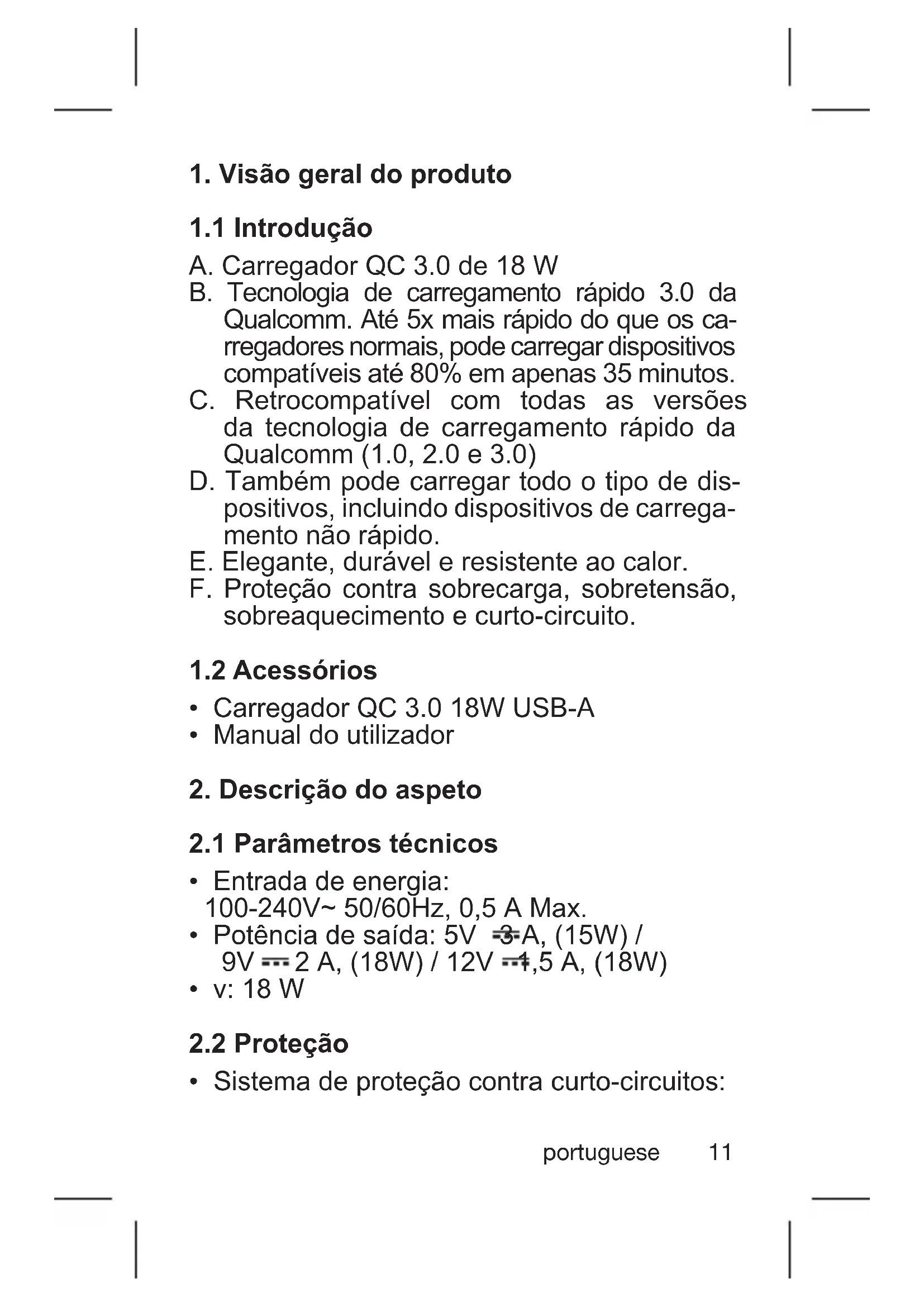 A. Carregador QC 3.0 de 18 W B. Tecnologia de carregamento rápido 3.0 da Qualcomm. Até 5x mais rápido do que os ca- rregadores normais, pode carregar dispositivos compatíveis até 80% em apenas 35 minutos. C. Retrocompatível com todas as versões da tecnologia de carregamento rápido da Qualcomm (1.0, 2.0 e 3.0) D. Também pode carregar todo o tipo de dis- positivos, incluindo dispositivos de carrega- mento não rápido. E. Elegante, durável e resistente ao calor. F. Proteção contra sobrecarga, sobretensão, sobreaquecimento e curto-circuito.