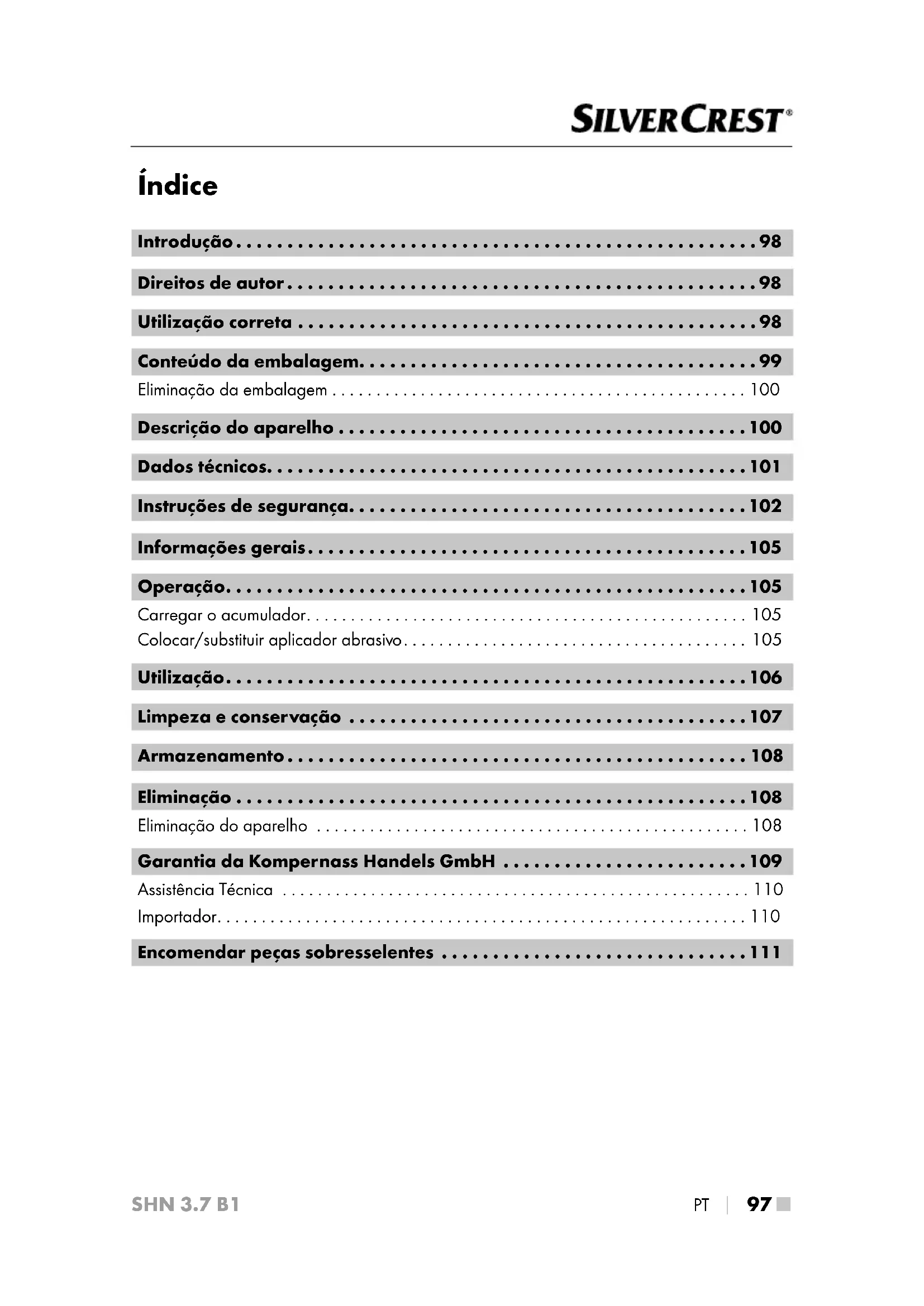 111 ■ SHN 3.7 B1 Encomendar peças sobresselentes As seguintes peças sobresselentes podem ser encomendadas para o produto SHN 3.7 B1: ► 2 aplicadores abrasivos (grosso e fino) Encomende as peças sobresselentes através da nossa linha direta de Assistência Técnica (ver capítulo “Assistência Técnica”) ou confortavelmente no nosso Web site, em www.kompernass.com. NOTA ► Tenha o número IAN, que se encontra na capa deste manual de instruções, à mão, para a sua encomenda.IAN 290065