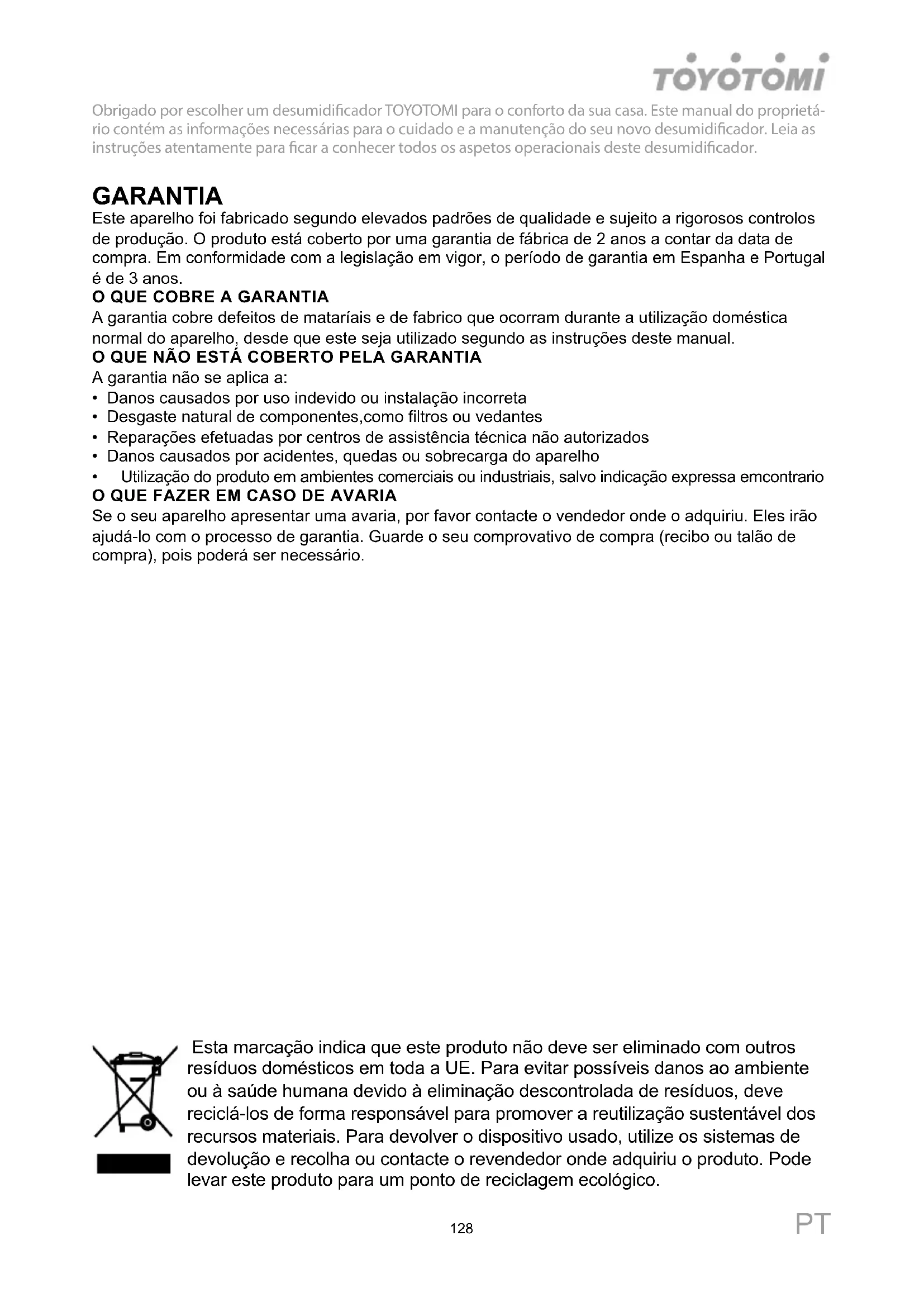 Obrigado por escolher um desumidicador TOYOTOMI para o conforto da sua casa. Este manual do proprietá- rio contém as informações necessárias para o cuidado e a manutenção do seu novo desumidicador. Leia as instruções atentamente para car a conhecer todos os aspetos operacionais deste desumidicador. GARANTIA Este aparelho foi fabricado segundo elevados padrões de qualidade e sujeito a rigorosos controlos de produção. O produto está coberto por uma garantia de fábrica de 2 anos a contar da data de compra. Em conformidade com a legislação em vigor, o período de garantia em Espanha e Portugal é de 3 anos.O QUE COBRE A GARANTIAA garantia cobre defeitos de mataríais e de fabrico que ocorram durante a utilização doméstica normal do aparelho, desde que este seja utilizado segundo as instruções deste manual.O QUE NÃO ESTÁ COBERTO PELA GARANTIAA garantia não se aplica a:• Danos causados por uso indevido ou instalação incorreta• Desgaste natural de componentes,como filtros ou vedantes• Reparações efetuadas por centros de assistência técnica não autorizados• Danos causados por acidentes, quedas ou sobrecarga do aparelho