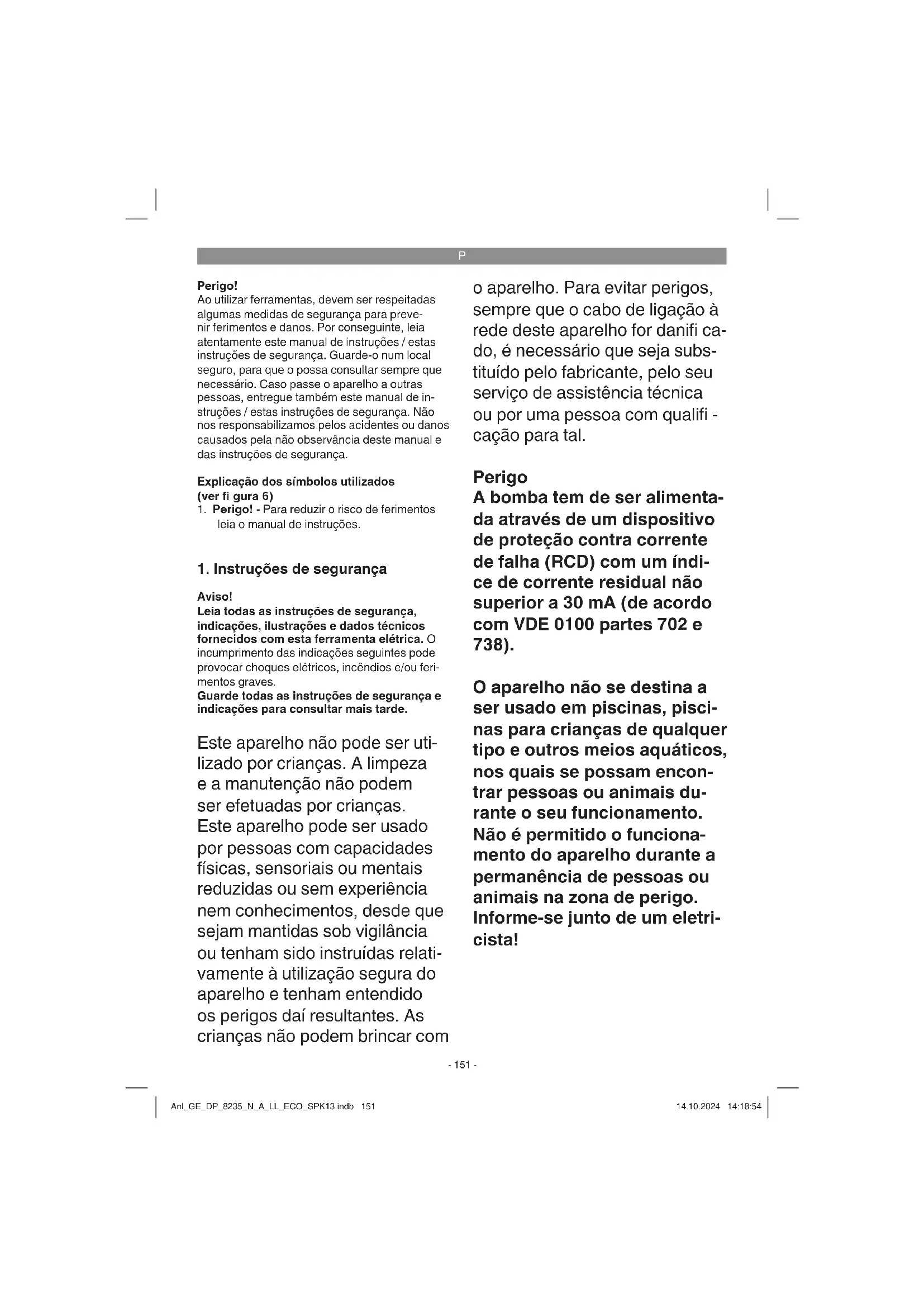 Aviso! Leia todas as instruções de segurança, indicações, ilustrações e dados técnicos fornecidos com esta ferramenta elétrica. O incumprimento das indicações seguintes pode provocar choques elétricos, incêndios e/ou feri- mentos graves. Guarde todas as instruções de segurança e indicações para consultar mais tarde. Este aparelho não pode ser uti- lizado por crianças. A limpeza e a manutenção não podem ser efetuadas por crianças. Este aparelho pode ser usado por pessoas com capacidades físicas, sensoriais ou mentais reduzidas ou sem experiência nem conhecimentos, desde que sejam mantidas sob vigilância ou tenham sido instruídas relati- vamente à utilização segura do aparelho e tenham entendido os perigos daí resultantes. As crianças não podem brincar com o aparelho. Para evitar perigos, sempre que o cabo de ligação à rede deste aparelho for danifi ca- do, é necessário que seja subs- tituído pelo fabricante, pelo seu serviço de assistência técnica ou por uma pessoa com qualifi - cação para tal. Perigo A bomba tem de ser alimenta- da através de um dispositivo de proteção contra corrente de falha (RCD) com um índi- ce de corrente residual não superior a 30 mA (de acordo com VDE 0100 partes 702 e 738). O aparelho não se destina a ser usado em piscinas, pisci- nas para crianças de qualquer tipo e outros meios aquáticos, nos quais se possam encon- trar pessoas ou animais du- rante o seu funcionamento. Não é permitido o funciona- mento do aparelho durante a permanência de pessoas ou animais na zona de perigo. Informe-se junto de um eletri- cista! Anl_GE_DP_8235_N_A_LL_ECO_SPK13.indb 151Anl_GE_DP_8235_N_A_LL_ECO_SPK13.indb 151 14.10.2024 14:18:5414.10.2024 14:18:54P
