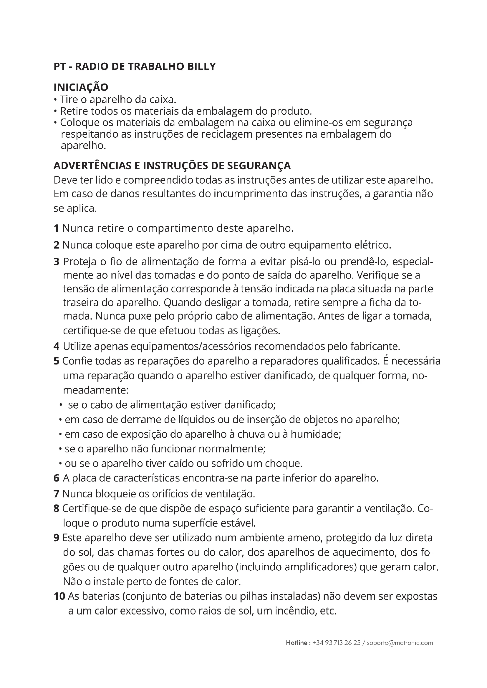 - ou se o aparelho tiver caído ou sofrido um choque. 6 A placa de características encontra-se na parte inferior do aparelho. 7 Nunca bloqueie os orifícios de ventilação. 8 Certique-se de que dispõe de espaço suciente para garantir a ventilação. Co- loque o produto numa superfície estável. 9 Este aparelho deve ser utilizado num ambiente ameno, protegido da luz direta do sol, das chamas fortes ou do calor, dos aparelhos de aquecimento, dos fo- gões ou de qualquer outro aparelho (incluindo amplicadores) que geram calor. Não o instale perto de fontes de calor. 10 As baterias (conjunto de baterias ou pilhas instaladas) não devem ser expostas a um calor excessivo, como raios de sol, um incêndio, etc.Hotline : +34 93 713 26 25 / soporte@metronic.com