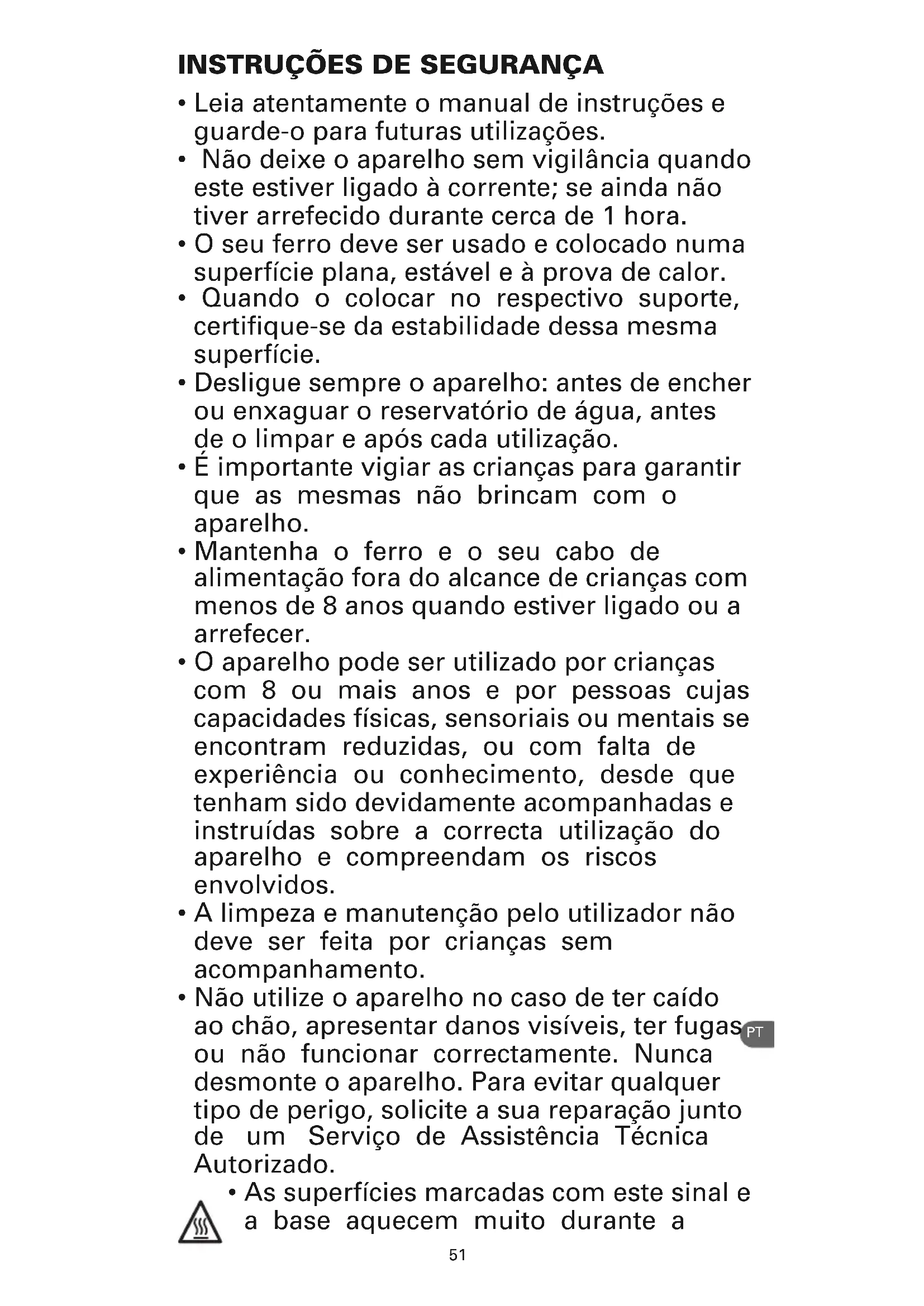 - As superfícies marcadas com este sinal e a base aquecem muito durante a 1103910025 DZ5000 D1 _110x220mm 15/03/13 11:15 Page5152 utilização dos aparelhos. Não toque nestas superfícies antes do ferro arrefecer completamente.