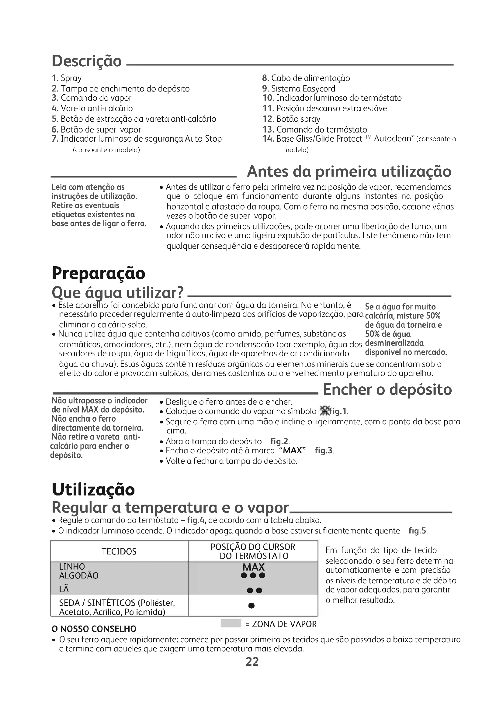 O seu ferro aquece rapidamente: comece por passar primeiro os tecidos que são passados a baixa temperatura e termine com aqueles que exigem uma temperatura mais elevada. Leia com atenção as instruções de utilização. Retire as eventuais etiquetas existentes na base antes de ligar o ferro. Não ultrapasse o indicador de nível MAX do depósito. Não encha o ferro directamente da torneira. Não retire a vareta anti- calcário para encher o depósito. Se a água for muito calcária, misture 50% de água da torneira e 50% de água desmineralizada disponível no mercado.