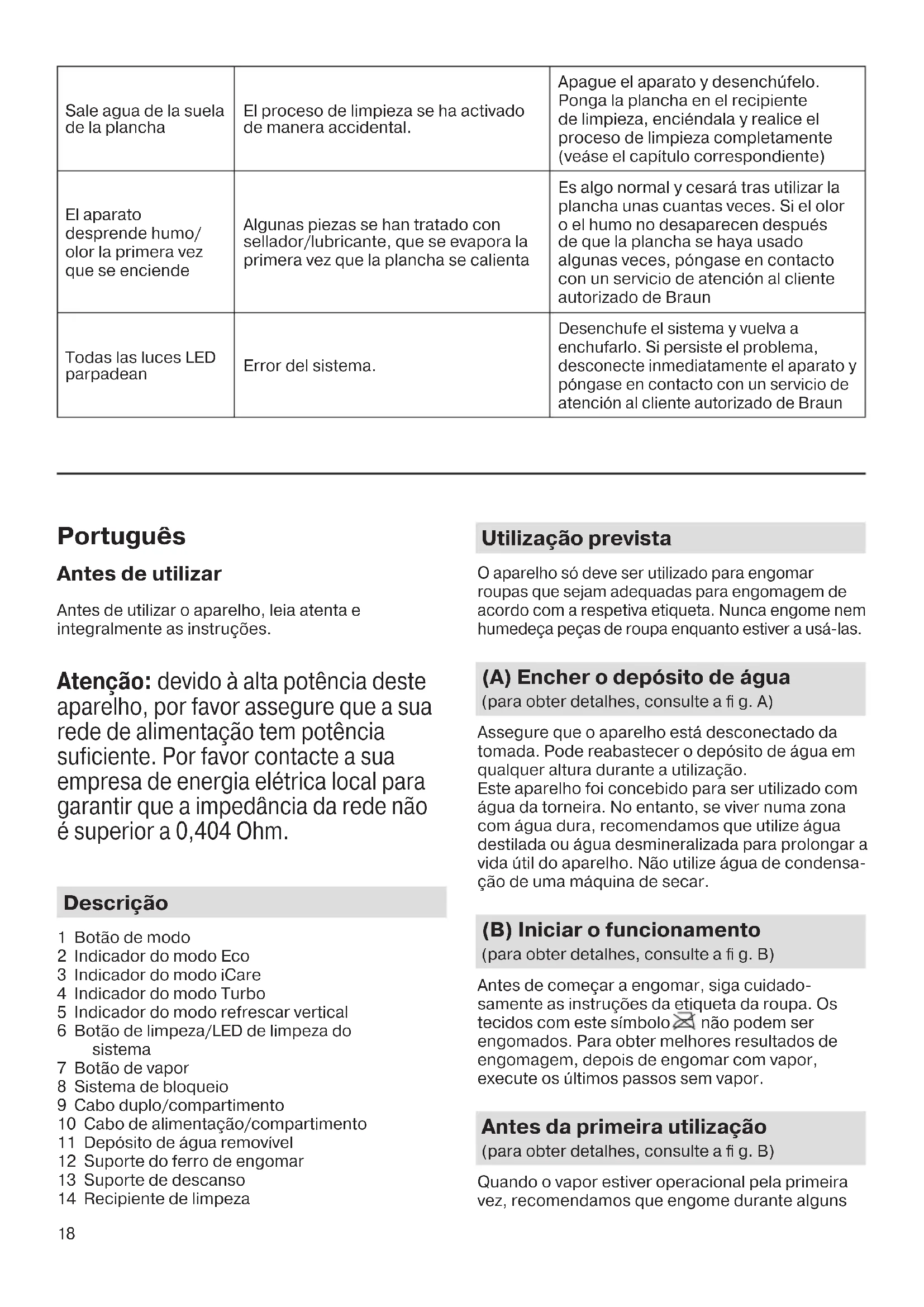 - Para continuar a engomar, pressione o botão de modo, limpeza ou vapor. Antes de começar a engomar novamente, aguarde até o símbolo correspondente fi car permanentemente aceso. (E) Descalcifi cação (para obter detalhes, consulte a fi g. E) O sistema lembra-lo-á para descalcifi cá-lo regularmente, independentemente do tipo de água utilizada. A descalcifi cação pode ser realizada em qualquer altura, mesmo quando não seja indicada pelo sistema. Se o LED de limpeza (6) e o sinal sonoro acenderem durante um processo de engomagem, é possível continuar a engomar. Não é necessário realizar a limpeza imediatamente. O procedimento de limpeza pode ser realizado quando o processo de engomagem tiver terminado ou na próxima vez que o aparelho for ligado. Se o aparelho for desligado sem ter realizado o processo de limpeza, o LED de limpeza e o sinal sonoro acenderão novamente na próxima vez que o aparelho for ligado. Se não existir fornecimento de vapor a partir do ferro e se estiverem presentes as seguintes condições: LED de limpeza "ligado", LED de controlo da temperatura "intermitente" e sinal acústico "activo", será obrigatório efetuar o proces- so de limpeza para continuar com a engomagem. Atenção: Não deixe o aparelho sem vigilância durante o processo de descalcifi cação. Realize sempre o processo de descalcifi cação com o recipiente de limpeza (14). Não interrompa o pro- cesso levantando o ferro do recipiente de limpeza, uma vez que sairá água quente e vapor da base. Atenção: O recipiente de limpeza pode estar quente e contém água quente, tenha cuidado ao deslocá-lo e esvaziá-lo. (F) Após a engomagem (para obter detalhes, consulte a fi g. F) Cuidados e limpeza Antes da limpeza, certifi que-se sempre de que o aparelho está desligado, desconetado da tomada e que arrefeceu completamente. Sistema de bloqueio O aparelho está equipado com um sistema de bloqueio (8) para um transporte conveniente e um armazenamento fácil. É possível levantar e trans- portar o aparelho pela pega do ferro bloqueado. NOTA: Antes de transportar, certifi que-se de que o ferro está bloqueado corretamente e que arrefeceu completamente. Armazenamento Desligue da tomada e deixe o aparelho arrefecer (a base fi ca quente) antes de enrolar o cabo para armazenar (9,10). Garantia e Assistência Para informações detalhadas, consulte o folheto separado sobre garantia e assistência ou visite www.braunhousehold.com . 5712812441_03_IS_25xx_INT.indd 19 23.11.22 13:2620 Guia de resolução de problemas
