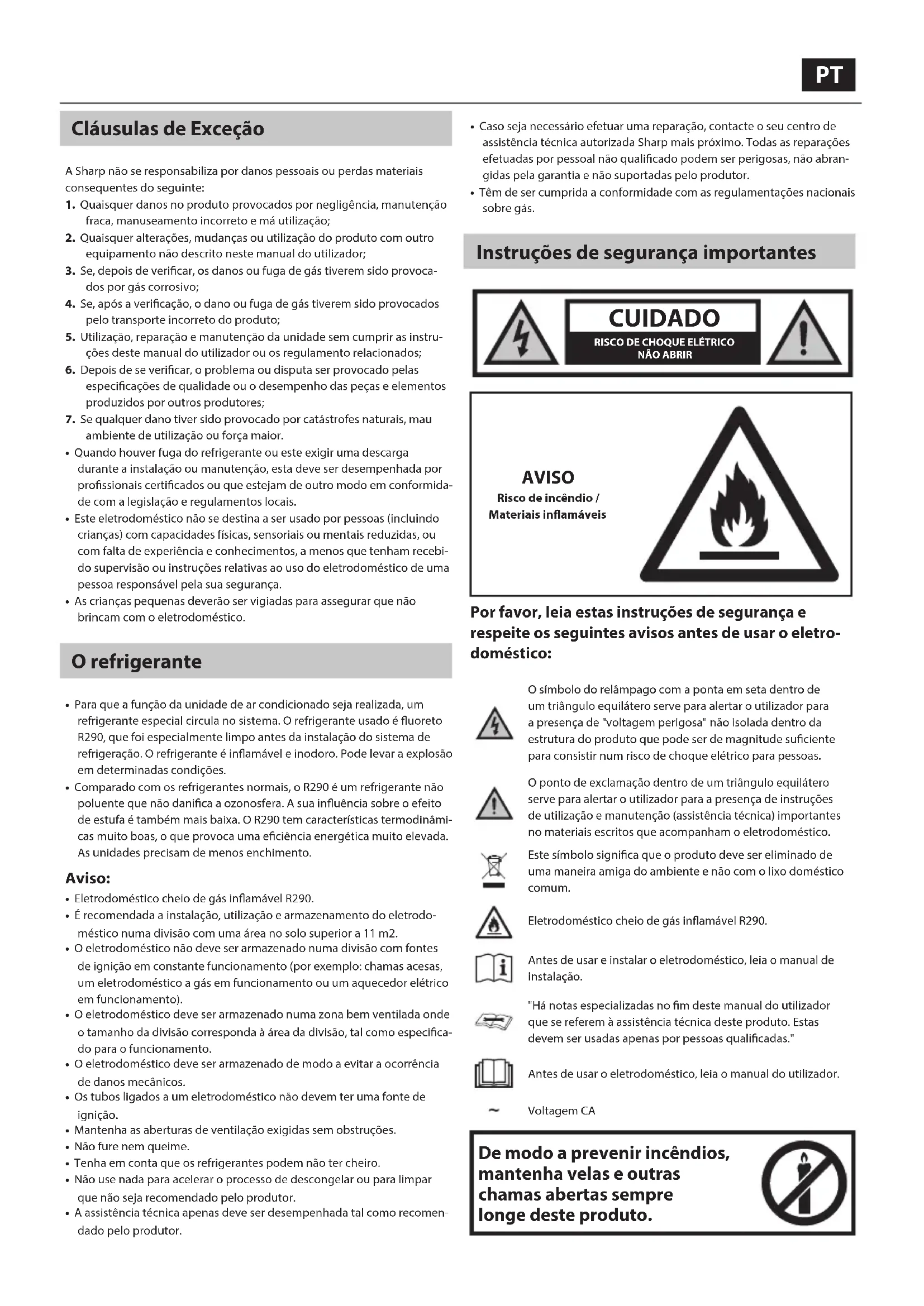 - Eletrodoméstico cheio de gás inamável R290.• É recomendada a instalação, utilização e armazenamento do eletrodo-méstico numa divisão com uma área no solo superior a 11 m2.• O eletrodoméstico não deve ser armazenado numa divisão com fontes de ignição em constante funcionamento (por exemplo: chamas acesas, um eletrodoméstico a gás em funcionamento ou um aquecedor elétrico em funcionamento).• O eletrodoméstico deve ser armazenado numa zona bem ventilada onde o tamanho da divisão corresponda à área da divisão, tal como especica-do para o funcionamento.• O eletrodoméstico deve ser armazenado de modo a evitar a ocorrência de danos mecânicos.• Os tubos ligados a um eletrodoméstico não devem ter uma fonte de ignição.• Mantenha as aberturas de ventilação exigidas sem obstruções.• Não fure nem queime.• Tenha em conta que os refrigerantes podem não ter cheiro.• Não use nada para acelerar o processo de descongelar ou para limpar que não seja recomendado pelo produtor.• A assistência técnica apenas deve ser desempenhada tal como recomen-dado pelo produtor.• Caso seja necessário efetuar uma reparação, contacte o seu centro de assistência técnica autorizada Sharp mais próximo. Todas as reparações efetuadas por pessoal não qualicado podem ser perigosas, não abran-gidas pela garantia e não suportadas pelo produtor.• Têm de ser cumprida a conformidade com as regulamentações nacionais sobre gás. Instruções de segurança importantes CUIDADO RISCO DE CHOQUE ELÉTRICONÃO ABRIR AVISO Risco de incêndio / Materiais inamáveis Por favor, leia estas instruções de segurança e respeite os seguintes avisos antes de usar oeletro- doméstico: O símbolo do relâmpago com a ponta em seta dentro de um triângulo equilátero serve para alertar o utilizador para a presença de "voltagem perigosa" não isolada dentro da estrutura do produto que pode ser de magnitude suciente para consistir num risco de choque elétrico para pessoas.O ponto de exclamação dentro de um triângulo equilátero serve para alertar o utilizador para a presença de instruções de utilização e manutenção (assistência técnica) importantes no materiais escritos que acompanham o eletrodoméstico.Este símbolo signica que o produto deve ser eliminado de uma maneira amiga do ambiente e não com o lixo doméstico comum.Eletrodoméstico cheio de gás inamável R290.Antes de usar e instalar o eletrodoméstico, leia o manual de instalação."Há notas especializadas no m deste manual do utilizador que se referem à assistência técnica deste produto. Estas devem ser usadas apenas por pessoas qualicadas."Antes de usar o eletrodoméstico, leia o manual do utilizador.Voltagem CA De modo a prevenir incêndios, mantenha velas e outras chamas abertas sempre longe deste produto.