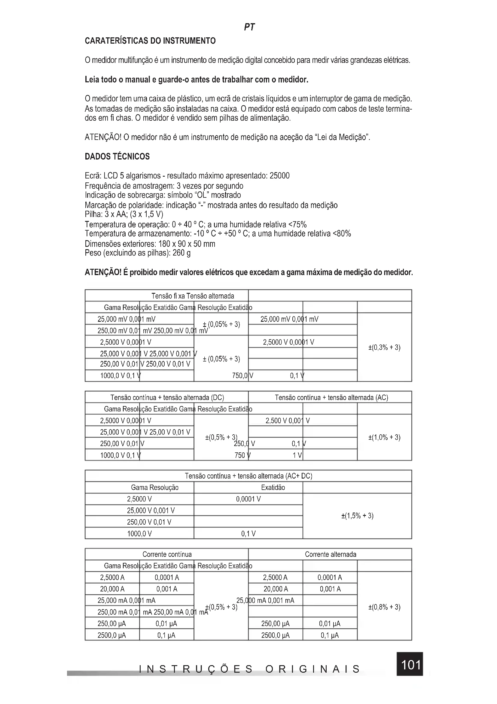 Ecrã: LCD 5 algarismos - resultado máximo apresentado: 25000 Frequência de amostragem: 3 vezes por segundo Indicação de sobrecarga: símbolo “OL” mostrado Marcação de polaridade: indicação “-” mostrada antes do resultado da medição Pilha: 3 x AA; (3 x 1,5 V) Temperatura de operação: 0 ÷ 40 º C; a uma humidade relativa <75% Temperatura de armazenamento: -10 º C ÷ +50 º C; a uma humidade relativa <80% Dimensões exteriores: 180 x 90 x 50 mm Peso (excluindo as pilhas): 260 g ATENÇÃO! É proibido medir valores elétricos que excedam a gama máxima de medição do medidor. Tensão fi xa Tensão alternada Gama Resolução Exatidão Gama Resolução Exatidão 25,000 mV 0,001 mV ± (0,05% + 3) 25,000 mV 0,001 mV ±(0,3% + 3) 250,00 mV 0,01 mV 250,00 mV 0,01 mV 2,5000 V 0,0001 V ± (0,05% + 3) 2,5000 V 0,0001 V 25,000 V 0,001 V 25,000 V 0,001 V 250,00 V 0,01 V 250,00 V 0,01 V 1000,0 V 0,1 V 750,0 V 0,1 V Tensão contínua + tensão alternada (DC) Tensão contínua + tensão alternada (AC) Gama Resolução Exatidão Gama Resolução Exatidão 2,5000 V 0,0001 V ±(0,5% + 3) 2,500 V 0,001 V ±(1,0% + 3) 25,000 V 0,001 V 25,00 V 0,01 V 250,00 V 0,01 V 250,0 V 0,1 V 1000,0 V 0,1 V 750 V 1 V Tensão contínua + tensão alternada (AC+ DC) Gama Resolução Exatidão 2,5000 V 0,0001 V ±(1,5% + 3) 25,000 V 0,001 V 250,00 V 0,01 V 1000,0 V 0,1 V Corrente contínua Corrente alternada Gama Resolução Exatidão Gama Resolução Exatidão 2,5000 A 0,0001 A ±(0,5% + 3) 2,5000 A 0,0001 A ±(0,8% + 3) 20,000 A 0,001 A 20,000 A 0,001 A 25,000 mA 0,001 mA 25,000 mA 0,001 mA 250,00 mA 0,01 mA 250,00 mA 0,01 mA 250,00 μA 0,01 μA 250,00 μA 0,01 μA 2500,0 μA 0,1 μA 2500,0 μA 0,1 μA102