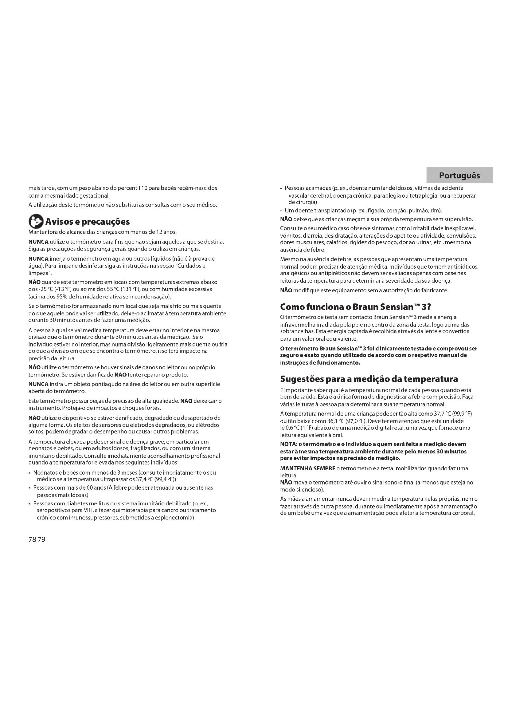 - Um doente transplantado (p. ex., fígado, coração, pulmão, rim). NÃO deixe que as crianças meçam a sua própria temperatura sem supervisão. Consulte o seu médico caso observe sintomas como irritabilidade inexplicável, vómitos, diarreia, desidratação, alterações do apetite ou atividade, convulsões, dores musculares, calafrios, rigidez do pescoço, dor ao urinar, etc., mesmo na ausência de febre. Mesmo na ausência de febre, as pessoas que apresentam uma temperatura normal podem precisar de atenção médica. Indivíduos que tomem antibióticos, analgésicos ou antipiréticos não devem ser avaliadas apenas com base nas leituras da temperatura para determinar a severidade da sua doença. NÃO modique este equipamento sem a autorização do fabricante. Como funciona o Braun Sensian™ 3? O termómetro de testa sem contacto Braun Sensian™ 3 mede a energia infravermelha irradiada pela pele no centro da zona da testa, logo acima das sobrancelhas. Esta energia captada é recolhida através da lente e convertida para um valor oral equivalente. O termómetro Braun Sensian™ 3 foi clinicamente testado e comprovou ser seguro e exato quando utilizado de acordo com o respetivo manual de instruções de funcionamento. Sugestões para a medição da temperatura É importante saber qual é a temperatura normal de cada pessoa quando está bem de saúde. Esta é a única forma de diagnosticar a febre com precisão. Faça várias leituras à pessoa para determinar a sua temperatura normal. A temperatura normal de uma criança pode ser tão alta como 37,7 °C (99,9 °F) ou tão baixa como 36,1 °C (97,0 °F). Deve ter em atenção que esta unidade lê 0,6 °C (1 °F) abaixo de uma medição digital retal, uma vez que fornece uma leitura equivalente à oral. NOTA: o termómetro e o indivíduo a quem será feita a medição devem estar à mesma temperatura ambiente durante pelo menos 30 minutos para evitar impactos na precisão da medição. MANTENHA SEMPRE o termómetro e a testa imobilizados quando faz uma leitura. NÃO mova o termómetro até ouvir o sinal sonoro nal (a menos que esteja no modo silencioso). As mães a amamentar nunca devem medir a temperatura nelas próprias, nem o fazer através de outra pessoa, durante ou imediatamente após a amamentação de um bebé uma vez que a amamentação pode afetar a temperatura corporal.80 81 Português Não se deve beber, comer ou estar sicamente ativo antes/durante a medição. Retire os chapéus e espere 10 minutos antes de fazer a medição. Antes de fazer uma medição, retire qualquer sujidade ou cabelos da área da testa. Espere 10 minutos depois de limpar a testa até fazer uma medição. MEÇA SEMPRE a temperatura seguindo as instruções. Os resultados da temperatura podem variar se o termómetro for colocado na posição errada. Nas seguintes situações, recomenda-se que se façam três medições de temperatura no mesmo local e que se considere a mais elevada das três como sendo a leitura: