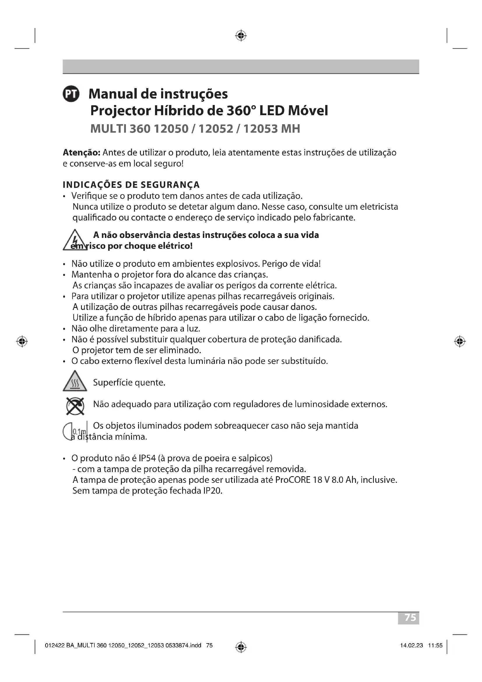 - O produto não é IP54 (à prova de poeira e salpicos) - com a tampa de proteção da pilha recarregável removida. A tampa de proteção apenas pode ser utilizada até ProCORE 18 V 8.0 Ah, inclusive. Sem tampa de proteção fechada IP20. 012422 BA_MULTI 360 12050_12052_12053 0533874.indd 75012422 BA_MULTI 360 12050_12052_12053 0533874.indd 75 14.02.23 11:5514.02.23 11:5576 Manual de instruções MULTI 360 12050 / 12052 / 12053 MH