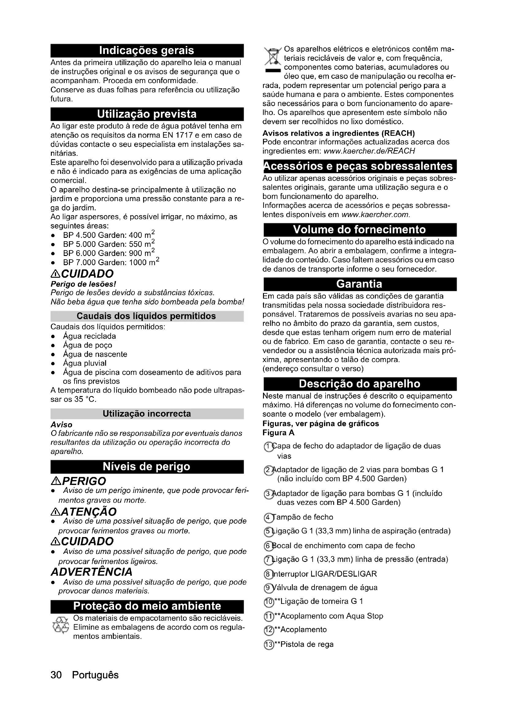 몇 CUIDADO Perigo de lesões! Perigo de lesões devido a substâncias tóxicas. Não beba água que tenha sido bombeada pela bomba! Caudais dos líquidos permitidos Caudais dos líquidos permitidos: ● Água reciclada ● Água de poço ● Água de nascente ● Água pluvial ● Água de piscina com doseamento de aditivos para os fins previstos A temperatura do líquido bombeado não pode ultrapas- sar os 35 °C. Utilização incorrecta Aviso O fabricante não se responsabiliza por eventuais danos resultantes da utilização ou operação incorrecta do aparelho. Níveis de perigo PERIGO ● Aviso de um perigo iminente, que pode provocar feri- mentos graves ou morte. 몇 ATENÇÃO ● Aviso de uma possível situação de perigo, que pode provocar ferimentos graves ou morte. 몇 CUIDADO ● Aviso de uma possível situação de perigo, que pode provocar ferimentos ligeiros. ADVERTÊNCIA ● Aviso de uma possível situação de perigo, que pode provocar danos materiais. Proteção do meio ambiente Os materiais de empacotamento são recicláveis. Elimine as embalagens de acordo com os regula- mentos ambientais. Os aparelhos elétricos e eletrónicos contêm ma- teriais recicláveis de valor e, com frequência, componentes como baterias, acumuladores ou óleo que, em caso de manipulação ou recolha er- rada, podem representar um potencial perigo para a saúde humana e para o ambiente. Estes componentes são necessários para o bom funcionamento do apare- lho. Os aparelhos que apresentem este símbolo não devem ser recolhidos no lixo doméstico. Avisos relativos a ingredientes (REACH) Pode encontrar informações actualizadas acerca dos ingredientes em: www.kaercher.de/REACH Acessórios e peças sobressalentes Ao utilizar apenas acessórios originais e peças sobres- salentes originais, garante uma utilização segura e o bom funcionamento do aparelho. Informações acerca de acessórios e peças sobressa- lentes disponíveis em www.kaercher.com. Volume do fornecimento O volume do fornecimento do aparelho está indicado na embalagem. Ao abrir a embalagem, confirme a integra- lidade do conteúdo. Caso faltem acessórios ou em caso de danos de transporte informe o seu fornecedor. Garantia Em cada país são válidas as condições de garantia transmitidas pela nossa sociedade distribuidora res- ponsável. Trataremos de possíveis avarias no seu apa- relho no âmbito do prazo da garantia, sem custos, desde que estas tenham origem num erro de material ou de fabrico. Em caso de garantia, contacte o seu re- vendedor ou a assistência técnica autorizada mais pró- xima, apresentando o talão de compra. (endereço consultar o verso) Descrição do aparelho Neste manual de instruções é descrito o equipamento máximo. Há diferenças no volume do fornecimento con- soante o modelo (ver embalagem). Figuras, ver página de gráficos Figura A 1 Capa de fecho do adaptador de ligação de duas vias 2 Adaptador de ligação de 2 vias para bombas G 1 (não incluído com BP 4.500 Garden) 3 Adaptador de ligação para bombas G 1 (incluído duas vezes com BP 4.500 Garden) 4 Tampão de fecho 5 Ligação G 1 (33,3 mm) linha de aspiração (entrada) 6 Bocal de enchimento com capa de fecho 7 Ligação G 1 (33,3 mm) linha de pressão (entrada) 8 Interruptor LIGAR/DESLIGAR 9 Válvula de drenagem de água 10 **Ligação de torneira G 1 11 **Acoplamento com Aqua Stop 12 **Acoplamento 13 **Pistola de regaPortuguês 31 14 *Conjunto de mangueira de aspiração incl. 3,5 m de mangueira em espiral pronta a ligar, à prova de vá- cuo com filtro de aspiração e paragem do refluxo 15 **Mangueira de jardim 1/2″ 20 m 16 Cabo de ligação à rede com ficha