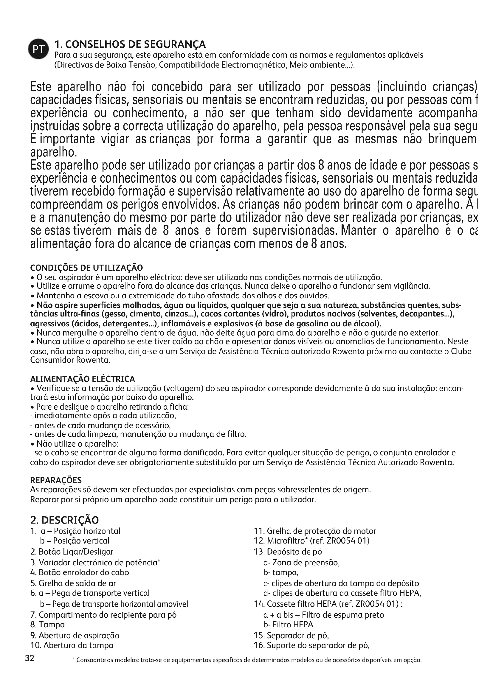 - Não utilize o aparelho: - se o cabo se encontrar de alguma forma danificado. Para evitar qualquer situação de perigo, o conjunto enrolador e cabo do aspirador deve ser obrigatoriamente substituído por um Serviço de Assistência Técnica Autorizado Rowenta. REPARAÇÕES As reparações só devem ser efectuadas por especialistas com peças sobresselentes de origem. Reparar por si próprio um aparelho pode constituir um perigo para o utilizador.