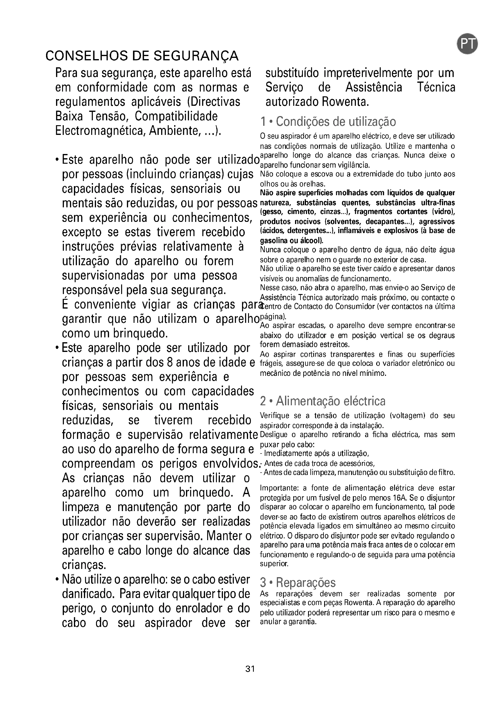 - Não utilize o aparelho: se o cabo estiver danificado. Para evitar qualquer tipo de perigo, o conjunto do enrolador e do cabo do seu aspirador deve ser substituído impreterivelmente por um Serviço de Assistência Técnica autorizado Rowenta. 1 • Condições de utilização O seu aspirador é um aparelho eléctrico, e deve ser utilizado nas condições normais de utilização. Utilize e mantenha o aparelho longe do alcance das crianças. Nunca deixe o aparelho funcionar sem vigilância. Não coloque a escova ou a extremidade do tubo junto aos olhos ou às orelhas. Não aspire superfícies molhadas com líquidos de qualquer natureza, substâncias quentes, substâncias ultra-finas (gesso, cimento, cinzas...), fragmentos cortantes (vidro), produtos nocivos (solventes, decapantes...), agressivos (ácidos, detergentes...), inflamáveis e explosivos (à base de gasolina ou álcool). Nunca coloque o aparelho dentro de água, não deite água sobre o aparelho nem o guarde no exterior de casa. Não utilize o aparelho se este tiver caído e apresentar danos visíveis ou anomalias de funcionamento. Nesse caso, não abra o aparelho, mas envie-o ao Serviço de Assistência Técnica autorizado mais próximo, ou contacte o Centro de Contacto do Consumidor (ver contactos na última página). Ao aspirar escadas, o aparelho deve sempre encontrar-se abaixo do utilizador e em posição vertical se os degraus forem demasiado estreitos. Ao aspirar cortinas transparentes e finas ou superfícies frágeis, assegure-se de que coloca o variador eletrónico ou mecânico de potência no nível mínimo. 2 • Alimentação eléctrica Verifique se a tensão de utilização (voltagem) do seu aspirador corresponde à da instalação. Desligue o aparelho retirando a ficha eléctrica, mas sem puxar pelo cabo: - Imediatamente após a utilização, - Antes de cada troca de acessórios, - Antes de cada limpeza, manutenção ou substituição de filtro. Importante: a fonte de alimentação elétrica deve estar protegida por um fusível de pelo menos 16A. Se o disjuntor disparar ao colocar o aparelho em funcionamento, tal pode dever-se ao facto de existirem outros aparelhos elétricos de potência elevada ligados em simultâneo ao mesmo circuito elétrico. O disparo do disjuntor pode ser evitado regulando o aparelho para uma potência mais fraca antes de o colocar em funcionamento e regulando-o de seguida para uma potência superior. 3 • Reparações As reparações devem ser realizadas somente por especialistas e com peças Rowenta. A reparação do aparelho pelo utilizador poderá representar um risco para o mesmo e anular a garantia.