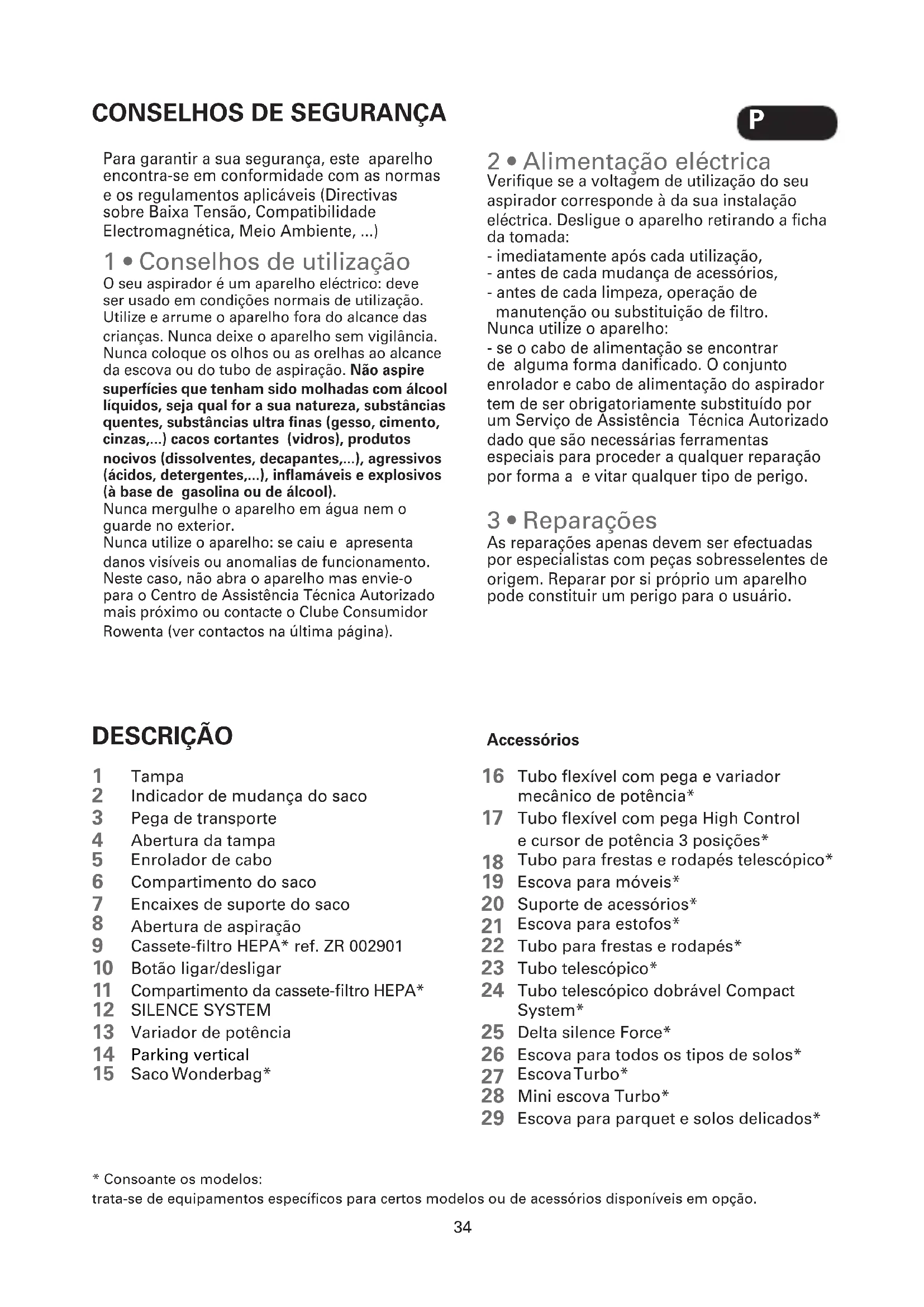 DESCRIÇÃO Tampa Indicador de mudança do saco Pega de transporte Abertura da tampa Enrolador de cabo Compartimento do saco Encaixes de suporte do saco Abertura de aspiração Cassete-filtro HEPA* ref. ZR 002901 Botão ligar/desligar Compartimento da cassete-filtro HEPA* SILENCE SYSTEM Variador de potência Parking vertical Saco Wonderbag* Tubo flexível com pega e variador mecânico de potência* Tubo flexível com pega High Control e cursor de potência 3 posições* Tubo para frestas e rodapés telescópico* Escova para móveis* Suporte de acessórios* Escova para estofos* Tubo para frestas e rodapés* Tubo telescópico* Tubo telescópico dobrável Compact System* Delta silence Force* Escova para todos os tipos de solos* Escova Turbo* Mini escova Turbo* Escova para parquet e solos delicados*