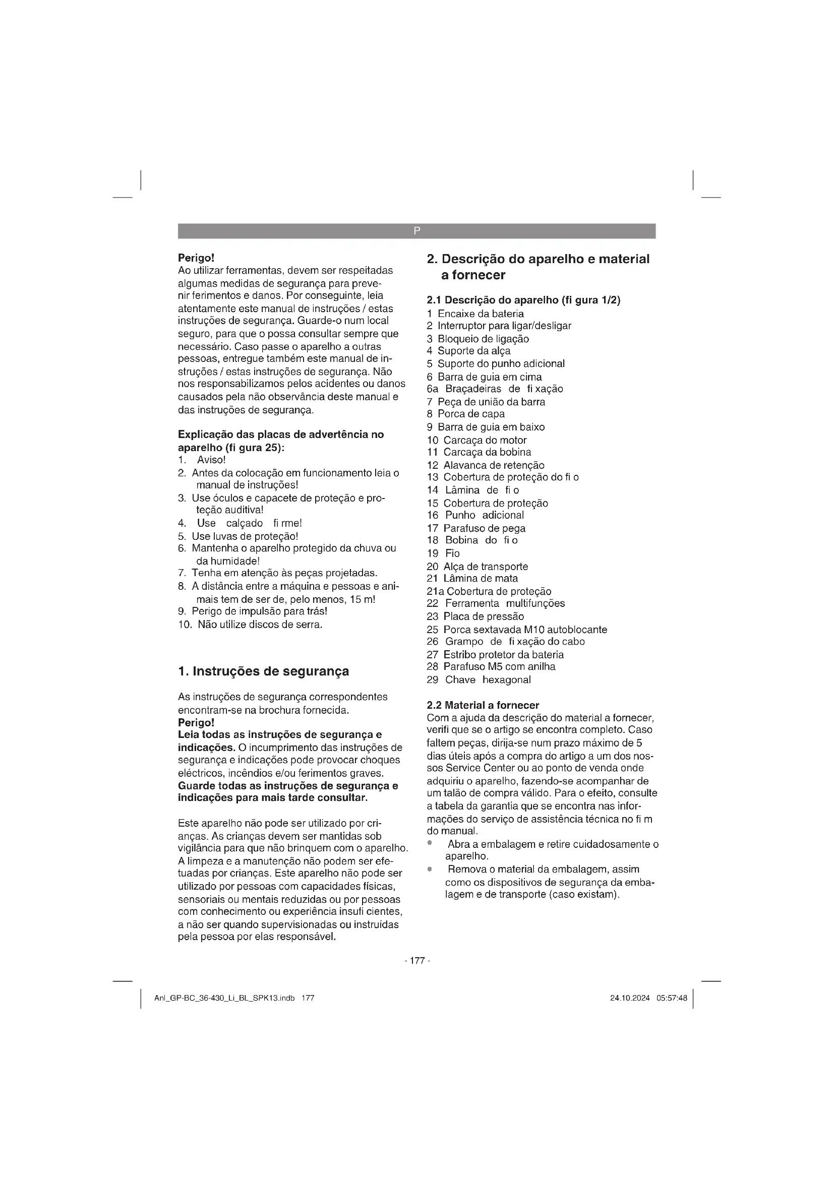 e o pack de acumuladores para o nosso serviço de assistência técnica. Para o envio correto, contacte o nosso ser- viço de assistência técnica ou o ponto de venda onde adquiriu o aparelho. Ao enviar ou eliminar baterias ou o aparelho sem fi o, certifi que-se de que estes são emba- lados individualmente em sacos de plástico para evitar curto-circuitos e incêndios! Anl_GP-BC_36-430_Li_BL_SPK13.indb 181Anl_GP-BC_36-430_Li_BL_SPK13.indb 181 24.10.2024 05:57:4924.10.2024 05:57:49P