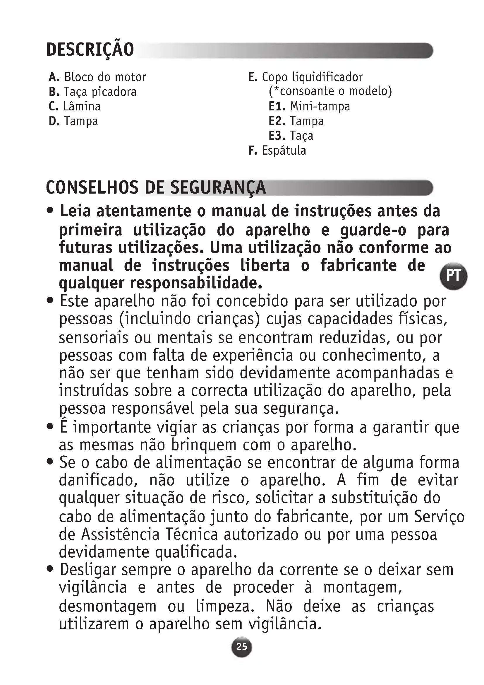 - Desligar sempre o aparelho da corrente se o deixar sem vigilância e antes de proceder à montagem, desmontagem ou limpeza. Não deixe as crianças utilizarem o aparelho sem vigilância. DESCRIÇÃO A. Bloco do motor B. Taça picadora C. Lâmina D. Tampa E. Copo liquidificador (*consoante o modelo) E1. Mini-tampa E2. Tampa E3. Taça F. Espátula