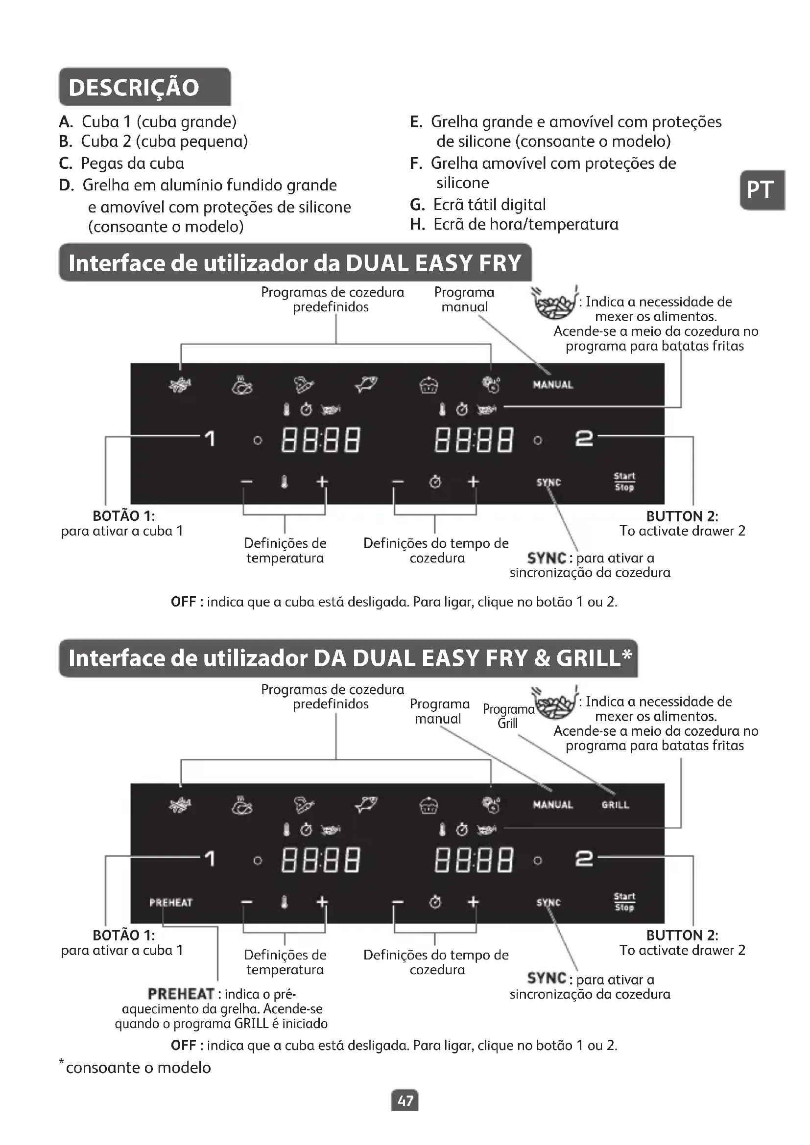 DESCRIÇÃO A. Cuba 1 (cuba grande) B. Cuba 2 (cuba pequena) C. Pegas da cuba D. Grelha em alumínio fundido grande e amovível com proteções de silicone (consoante o modelo) E. Grelha grande e amovível com proteções de silicone (consoante o modelo) F. Grelha amovível com proteções de silicone G. Ecrã tátil digital H. Ecrã de hora/temperatura Interface de utilizador da DUAL EASY FRY Interface de utilizador DA DUAL EASY FRY & GRILL* OFF : indica que a cuba está desligada. Para ligar, clique no botão 1 ou 2. OFF : indica que a cuba está desligada. Para ligar, clique no botão 1 ou 2. : indica o pré- aquecimento da grelha. Acende-se quando o programa GRILL é iniciado