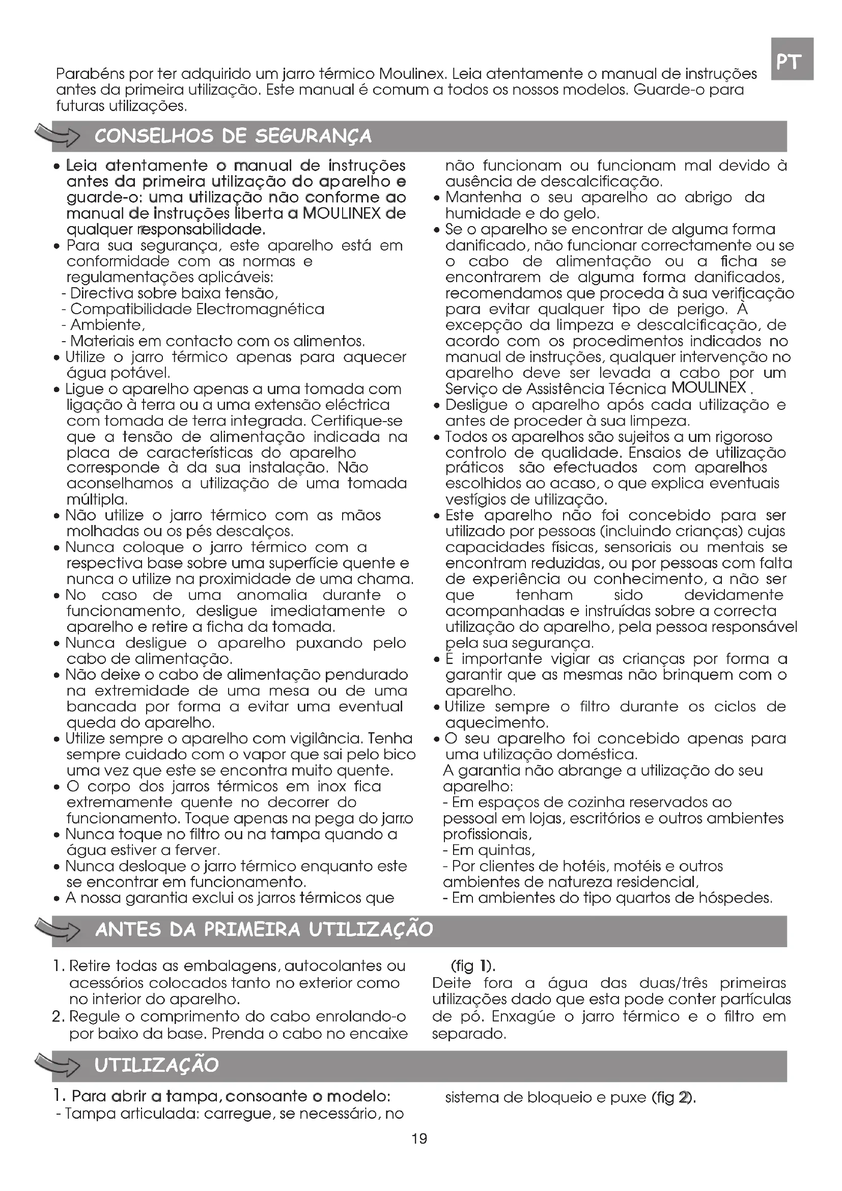 UTILIZAÇÃO Parabéns por ter adquirido um jarro térmico Moulinex. Leia atentamente o manual de instruções antes da primeira utilização. Este manual é comum a todos os nossos modelos. Guarde-o para futuras utilizações.