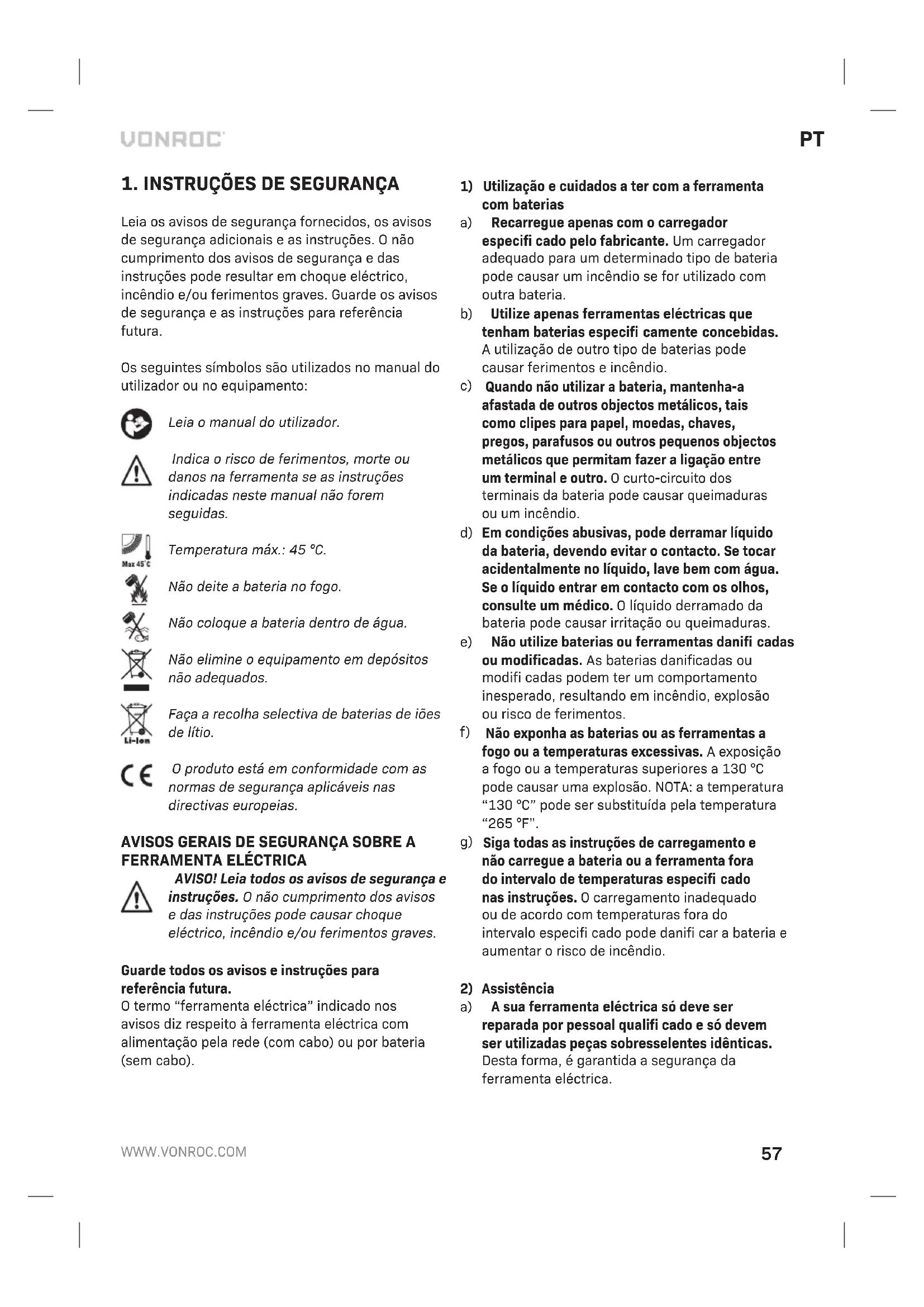 - Se forem utilizadas peças sobresselentes não originais. Isto constitui a única garantia feita pela empresa, de maneira expressa ou implícita. Não existem quaisquer outras garantias expressas ou implícitas que se prolonguem, incluindo as garantias implícitas de comercialização e adequação para fi ns específi cos. A VONROC não será, em nenhuma circunstância, responsável por danos incidentais ou indirectos. Os fornecedores devem estar limitados a reparar ou substituir as unidades ou peças que não estejam em conformidade. O equipamento e o manual do utilizador estão sujeitos a alterações sem aviso prévio. As especifi cações podem ser alteradas sem aviso prévio.
