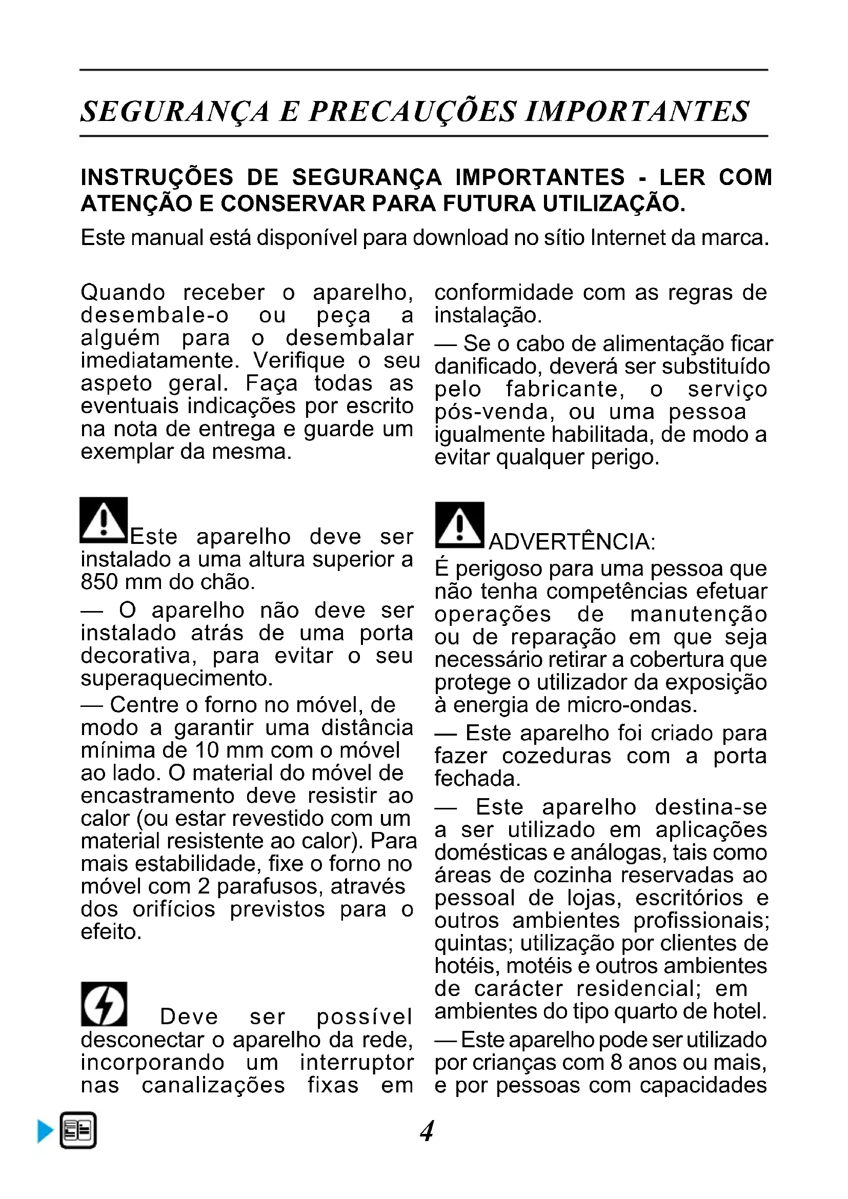 Quando receber o aparelho, desembale-o ou peça a alguém para o desembalar imediatamente. Verique o seu aspeto geral. Faça todas as eventuais indicações por escrito na nota de entrega e guarde um exemplar da mesma. Este aparelho deve ser instalado a uma altura superior a 850 mm do chão. — O aparelho não deve ser instalado atrás de uma porta decorativa, para evitar o seu superaquecimento. — Centre o forno no móvel, de modo a garantir uma distância mínima de 10 mm com o móvel ao lado. O material do móvel de encastramento deve resistir ao calor (ou estar revestido com um material resistente ao calor). Para mais estabilidade, xe o forno no móvel com 2 parafusos, através dos orifícios previstos para o efeito. Deve ser possível desconectar o aparelho da rede, incorporando um interruptor nas canalizações fixas em conformidade com as regras de instalação. — Se o cabo de alimentação car danicado, deverá ser substituído pelo fabricante, o serviço pós-venda, ou uma pessoa igualmente habilitada, de modo a evitar qualquer perigo. ADVERTÊNCIA: É perigoso para uma pessoa que não tenha competências efetuar operações de manutenção ou de reparação em que seja necessário retirar a cobertura que protege o utilizador da exposição à energia de micro-ondas. — Este aparelho foi criado para fazer cozeduras com a porta fechada. — Este aparelho destina-se a ser utilizado em aplicações domésticas e análogas, tais como áreas de cozinha reservadas ao pessoal de lojas, escritórios e outros ambientes prossionais; quintas; utilização por clientes de hotéis, motéis e outros ambientes de carácter residencial; em ambientes do tipo quarto de hotel. — Este aparelho pode ser utilizado por crianças com 8 anos ou mais, e por pessoas com capacidades INSTRUÇÕES DE SEGURANÇA IMPORTANTES - LER COM ATENÇÃO E CONSERVAR PARA FUTURA UTILIZAÇÃO. Este manual está disponível para download no sítio Internet da marca.5
