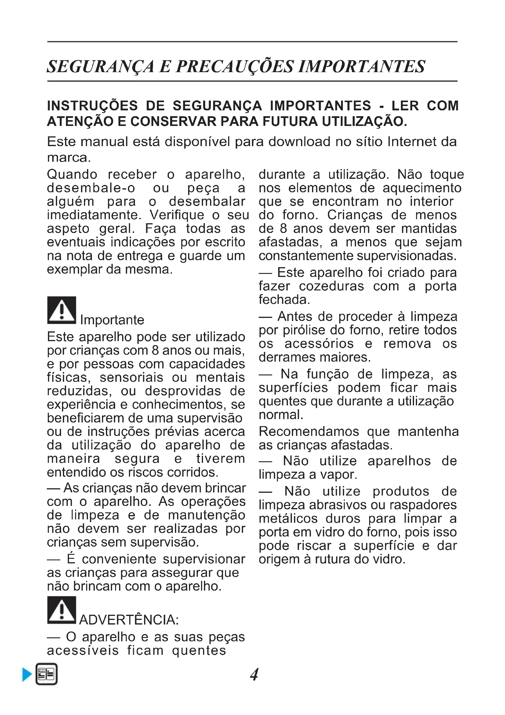 Quando receber o aparelho, desembale-o ou peça a alguém para o desembalar imediatamente. Verique o seu aspeto geral. Faça todas as eventuais indicações por escrito na nota de entrega e guarde um exemplar da mesma. Importante Este aparelho pode ser utilizado por crianças com 8 anos ou mais, e por pessoas com capacidades físicas, sensoriais ou mentais reduzidas, ou desprovidas de experiência e conhecimentos, se beneciarem de uma supervisão ou de instruções prévias acerca da utilização do aparelho de maneira segura e tiverem entendido os riscos corridos. — As crianças não devem brincar com o aparelho. As operações de limpeza e de manutenção não devem ser realizadas por crianças sem supervisão. — É conveniente supervisionar as crianças para assegurar que não brincam com o aparelho. ADVERTÊNCIA: — O aparelho e as suas peças acessíveis ficam quentes durante a utilização. Não toque nos elementos de aquecimento que se encontram no interior do forno. Crianças de menos de 8 anos devem ser mantidas afastadas, a menos que sejam constantemente supervisionadas. — Este aparelho foi criado para fazer cozeduras com a porta fechada. — Antes de proceder à limpeza por pirólise do forno, retire todos os acessórios e remova os derrames maiores. — Na função de limpeza, as superfícies podem ficar mais quentes que durante a utilização normal. Recomendamos que mantenha as crianças afastadas. — Não utilize aparelhos de limpeza a vapor. — Não utilize produtos de limpeza abrasivos ou raspadores metálicos duros para limpar a porta em vidro do forno, pois isso pode riscar a superfície e dar origem à rutura do vidro. INSTRUÇÕES DE SEGURANÇA IMPORTANTES - LER COM ATENÇÃO E CONSERVAR PARA FUTURA UTILIZAÇÃO. Este manual está disponível para download no sítio Internet da marca.5