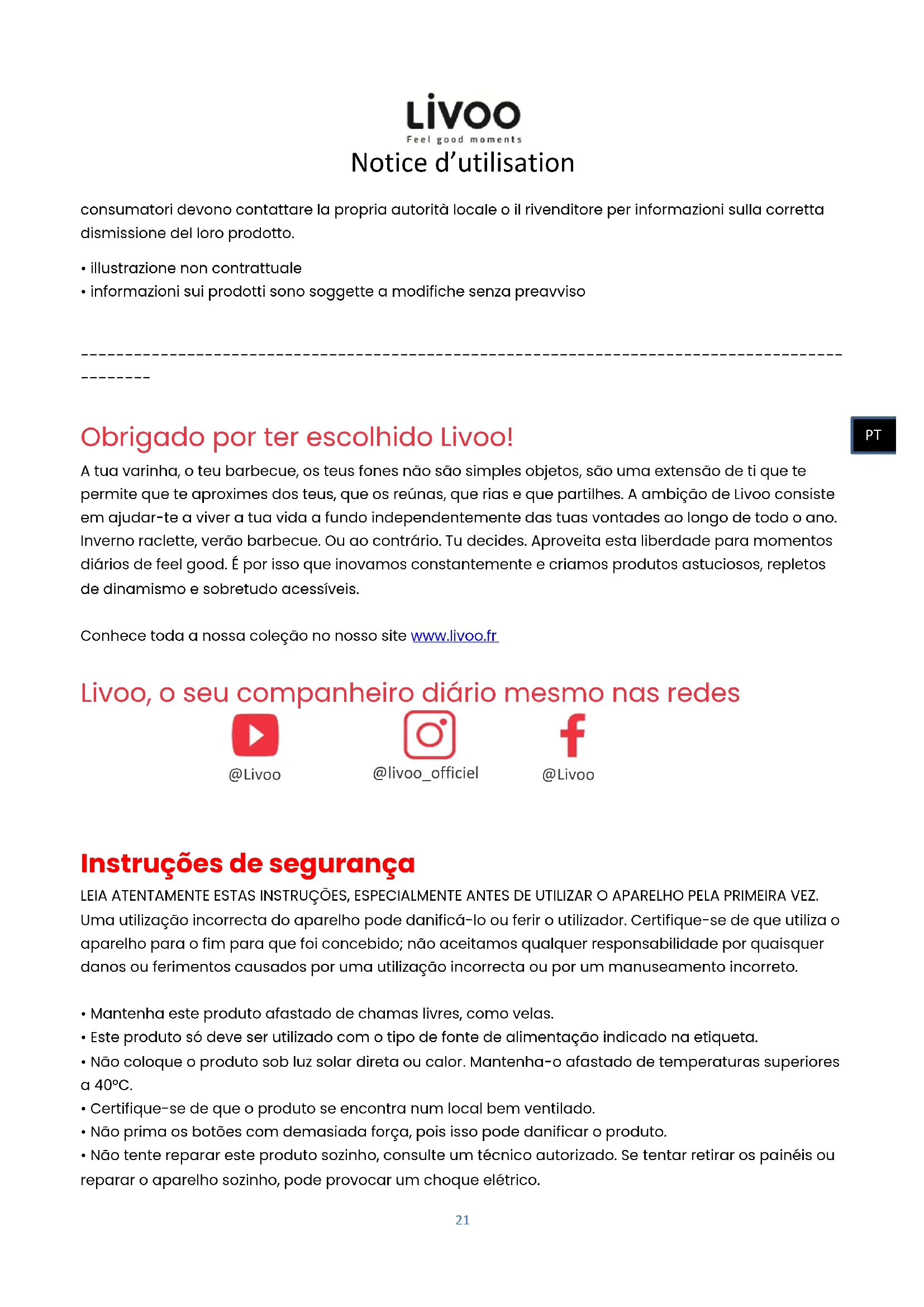 Obrigado por ter escolhido Livoo! A tua varinha, o teu barbecue, os teus fones não são simples objetos, são uma extensão de ti que te permite que te aproximes dos teus, que os reúnas, que rias e que partilhes. A ambição de Livoo consiste em ajudar-te a viver a tua vida a fundo independentemente das tuas vontades ao longo de todo o ano. Inverno raclette, verão barbecue. Ou ao contrário. Tu decides. Aproveita esta liberdade para momentos diários de feel good. É por isso que inovamos constantemente e criamos produtos astuciosos, repletos de dinamismo e sobretudo acessíveis. Conhece toda a nossa coleção no nosso site www.livoo.fr Livoo, o seu companheiro diário mesmo nas redes