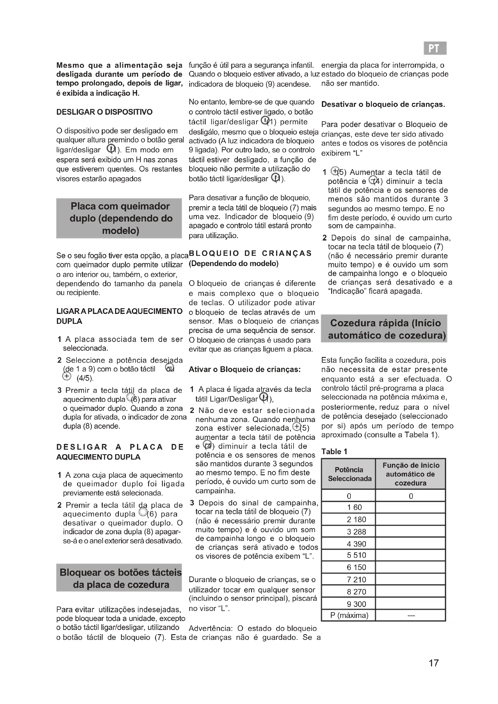 (Dependendo do modelo) O bloqueio de crianças é diferente e mais complexo que o bloqueio de teclas. O utilizador pode ativar o bloqueio de teclas através de um sensor. Mas o bloqueio de crianças precisa de uma sequência de sensor. O bloqueio de crianças é usado para evitar que as crianças liguem a placa. Ativar o Bloqueio de crianças: 1 A placa é ligada através da tecla tátil Ligar/Desligar (1), 2 Não deve estar selecionada nenhuma zona. Quando nenhuma zona estiver selecionada, (5) aumentar a tecla tátil de potência e (4) diminuir a tecla tátil de potência e os sensores de menos são mantidos durante 3 segundos ao mesmo tempo. E no m deste período, é ouvido um curto som de campainha. 3 Depois do sinal de campainha, tocar na tecla tátil de bloqueio (7) (não é necessário premir durante muito tempo) e é ouvido um som de campainha longo e o bloqueio de crianças será ativado e todos os visores de potência exibem “L”. Durante o bloqueio de crianças, se o utilizador tocar em qualquer sensor (incluindo o sensor principal), piscará no visor “L”. Advertência: O estado do bloqueio de crianças não é guardado. Se a energia da placa for interrompida, o estado do bloqueio de crianças pode não ser mantido. Desativar o bloqueio de crianças. Para poder desativar o Bloqueio de crianças, este deve ter sido ativado antes e todos os visores de potência exibirem “L” 1 (5) Aumentar a tecla tátil de potência e (4) diminuir a tecla tátil de potência e os sensores de menos são mantidos durante 3 segundos ao mesmo tempo. E no m deste período, é ouvido um curto som de campainha. 2 Depois do sinal de campainha, tocar na tecla tátil de bloqueio (7) (não é necessário premir durante muito tempo) e é ouvido um som de campainha longo e o bloqueio de crianças será desativado e a “Indicação” cará apagada. Cozedura rápida (Início automático de cozedura) Esta função facilita a cozedura, pois não necessita de estar presente enquanto está a ser efectuada. O controlo táctil pré-programa a placa seleccionada na potência máxima e, posteriormente, reduz para o nível de potência desejado (seleccionado por si) após um período de tempo aproximado (consulte a Tabela 1). Table 1 Potência Seleccionada Função de início automático de cozedura