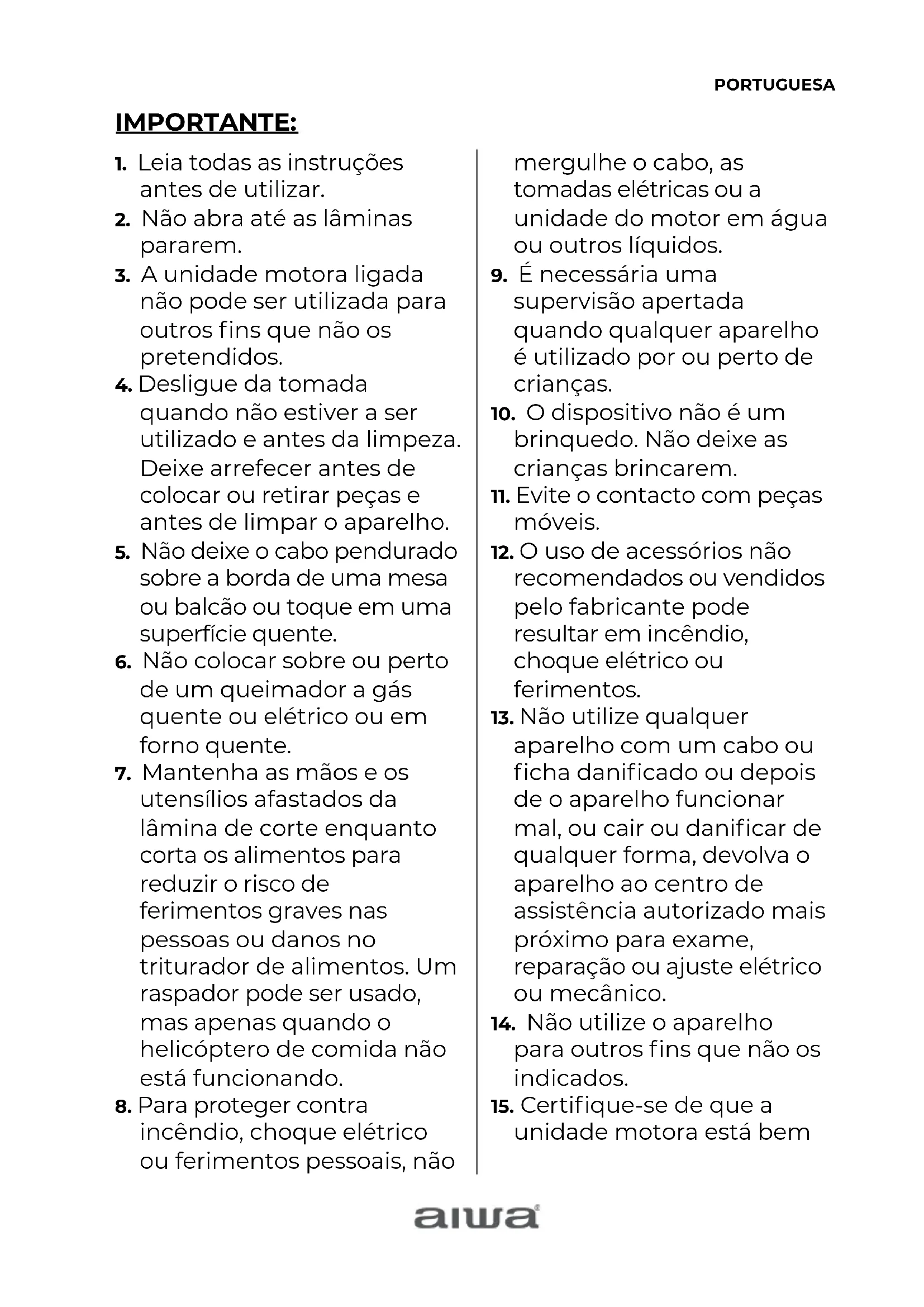 unidade motora. Desligue a unidade. Remova a unidade do motor e aperte o cubo da lâmina de plástico. Remova cuidadosamente o conjunto da lâmina. Retire a tigela e esvazie os alimentos processados. Não utilize recipientes para armazenar alimentos. LIMPEZA Desligue sempre o aparelho da tomada antes de o limpar. Lave o conjunto da taça e da lâmina imediatamente após a utilização, com água morna ou sabão ou na máquina de lavar loiça. Limpe a unidade motora com um pano húmido, não a mergulhe em água. NOTA: Não utilize produtos químicos, de aço, madeira ou produtos de limpeza abrasivos para limpar a unidade e evitar a perda de brilho.PORTUGUESA