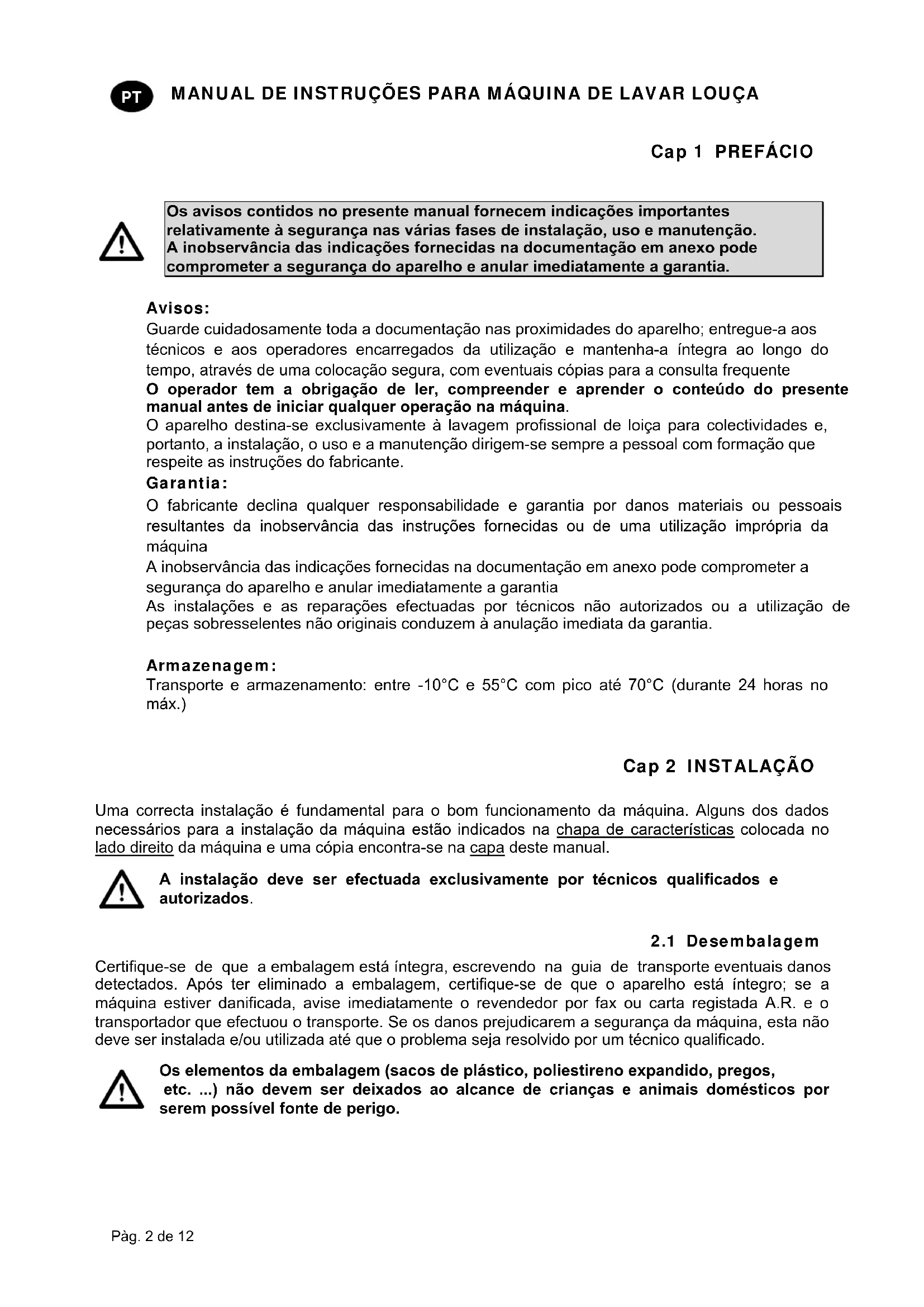 Os avisos contidos no presente manual fornecem indicações importantes relativamente à segurança nas várias fases de instalação, uso e manutenção. A inobservância das indicações fornecidas na documentação em anexo pode comprometer a segurança do aparelho e anular imediatamente a garantia. Avisos: Guarde cuidadosamente toda a documentação nas proximidades do aparelho; entregue-a aos técnicos e aos operadores encarregados da utilização e mantenha-a íntegra ao longo do tempo, através de uma colocação segura, com eventuais cópias para a consulta frequente O operador tem a obrigação de ler, compreender e aprender o conteúdo do presente manual antes de iniciar qualquer operação na máquina. O aparelho destina-se exclusivamente à lavagem profissional de loiça para colectividades e, portanto, a instalação, o uso e a manutenção dirigem-se sempre a pessoal com formação que respeite as instruções do fabricante. Garantia: O fabricante declina qualquer responsabilidade e garantia por danos materiais ou pessoais resultantes da inobservância das instruções fornecidas ou de uma utilização imprópria da máquina A inobservância das indicações fornecidas na documentação em anexo pode comprometer a segurança do aparelho e anular imediatamente a garantia As instalações e as reparações efectuadas por técnicos não autorizados ou a utilização de peças sobresselentes não originais conduzem à anulação imediata da garantia. Armazenagem: Transporte e armazenamento: entre -10°C e 55°C com pico até 70°C (durante 24 horas no máx.) Cap 2 INSTALAÇÃO