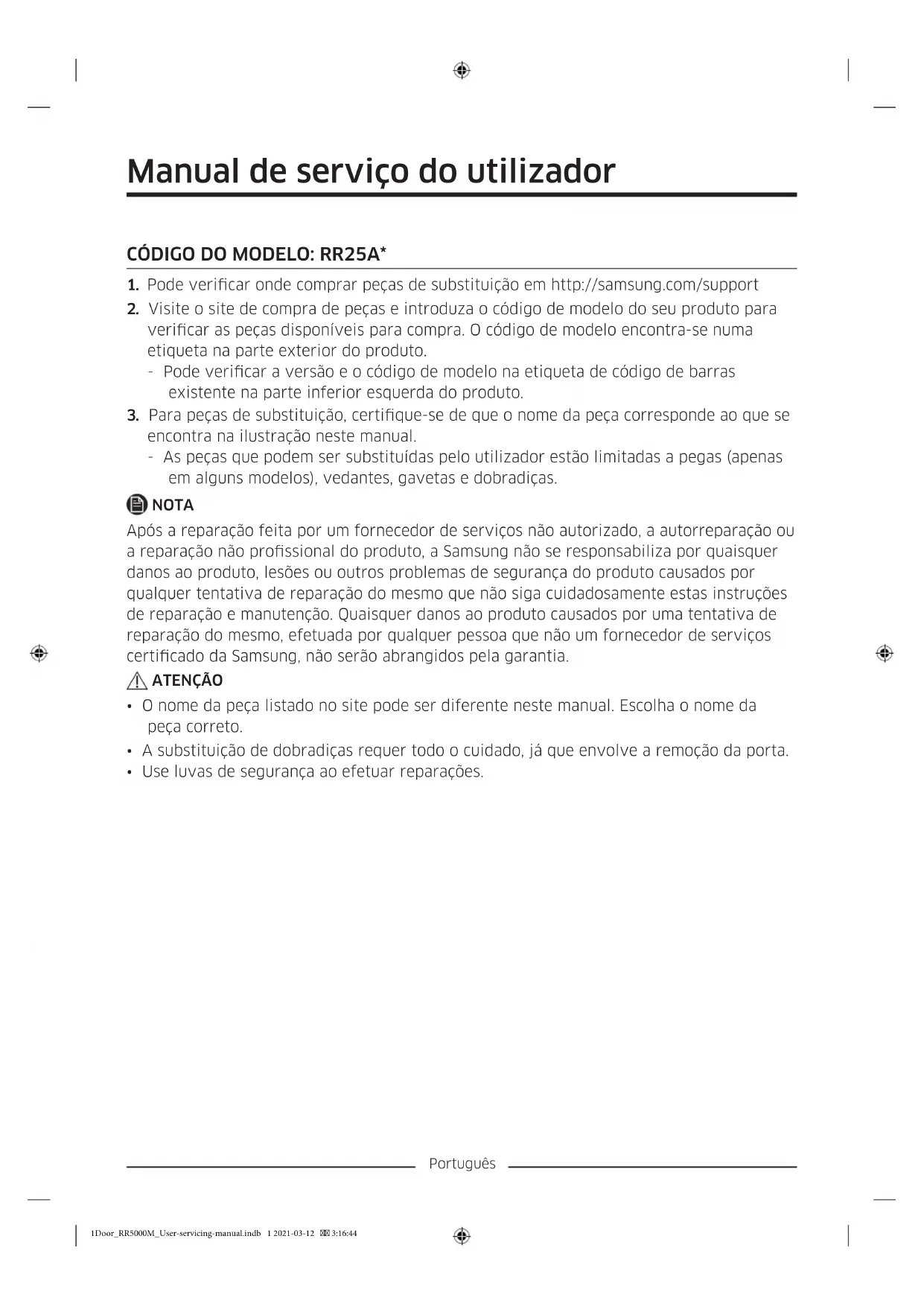 encontra na ilustração neste manual. - As peças que podem ser substituídas pelo utilizador estão limitadas a pegas (apenas em alguns modelos), vedantes, gavetas e dobradiças. NOTA Após a reparação feita por um fornecedor de serviços não autorizado, a autorreparação ou a reparação não prossional do produto, a Samsung não se responsabiliza por quaisquer danos ao produto, lesões ou outros problemas de segurança do produto causados por qualquer tentativa de reparação do mesmo que não siga cuidadosamente estas instruções de reparação e manutenção. Quaisquer danos ao produto causados por uma tentativa de reparação do mesmo, efetuada por qualquer pessoa que não um fornecedor de serviços certicado da Samsung, não serão abrangidos pela garantia. ATENÇÃO